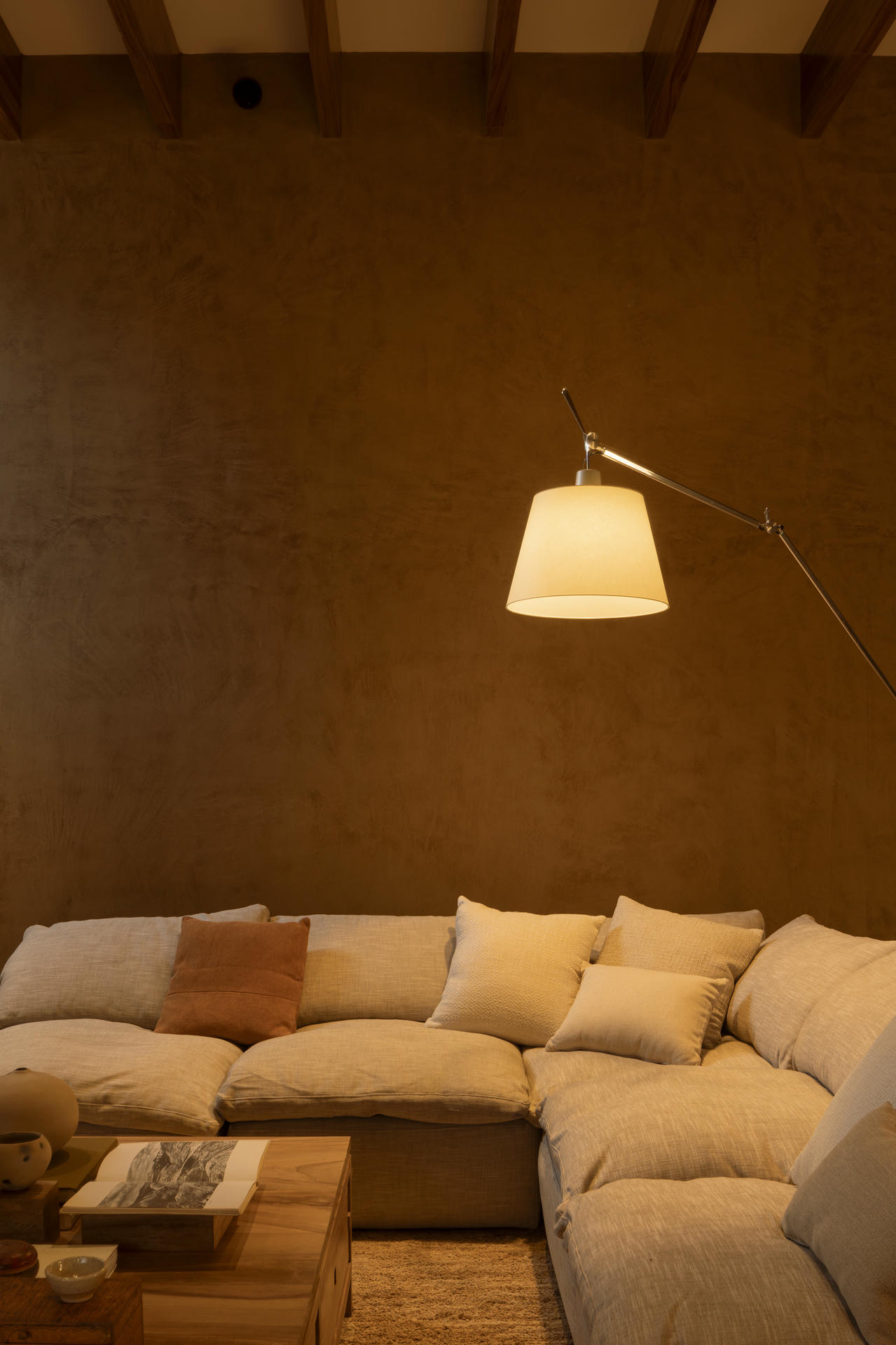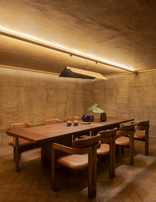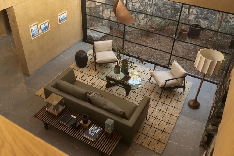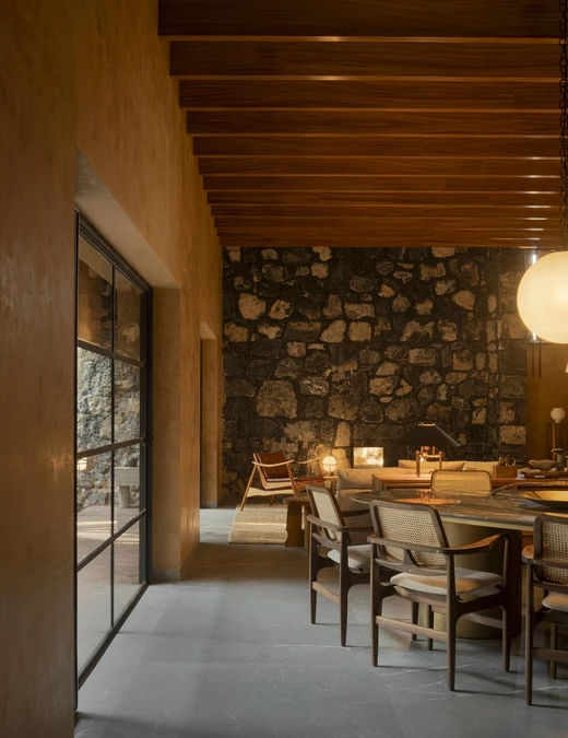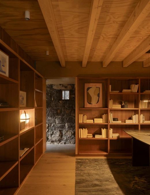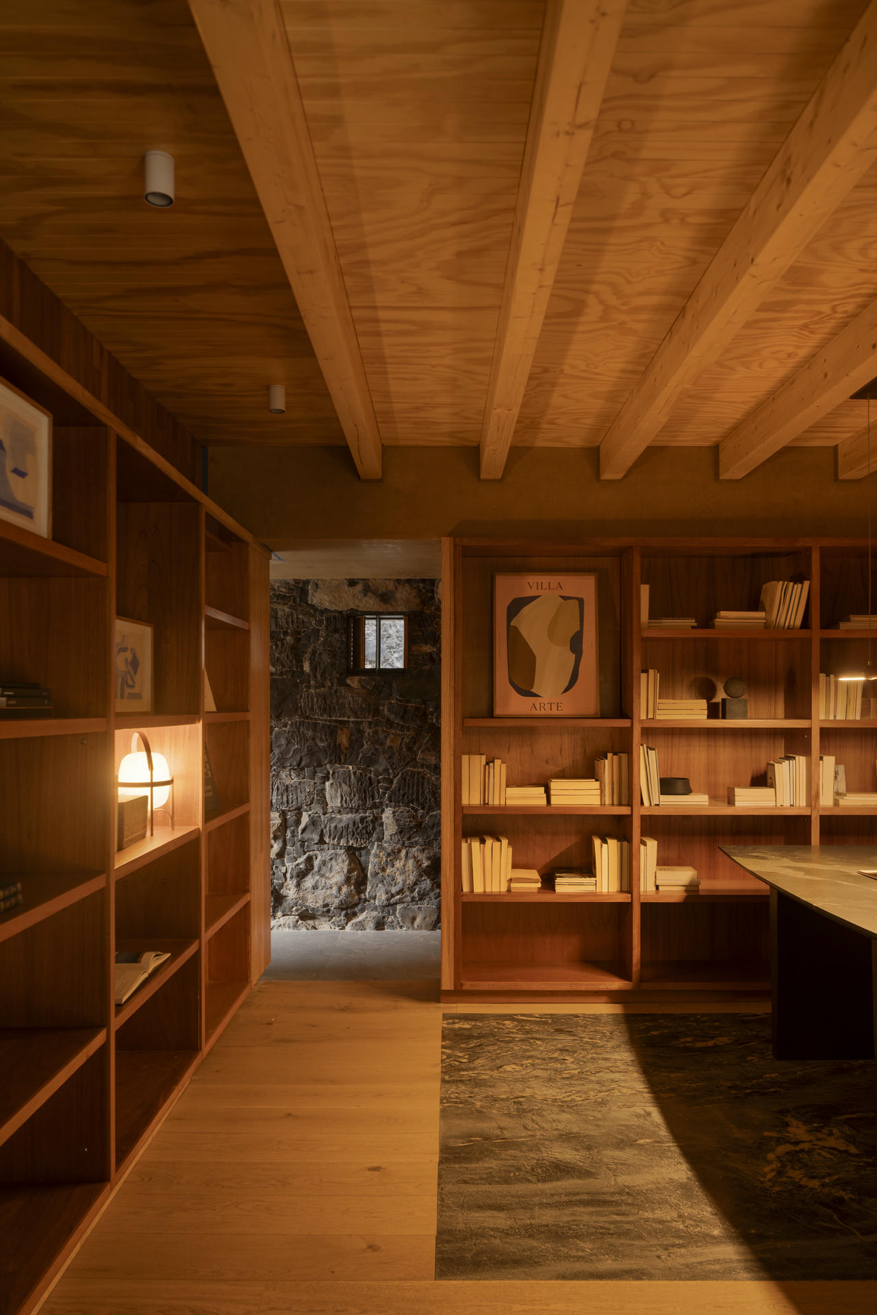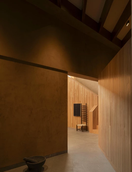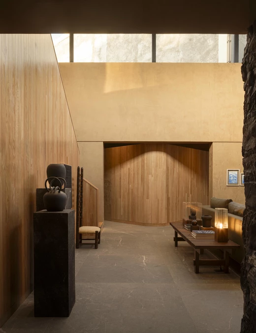 O charakterze budynku w dużej mierze decydują materiały. Mur wykonano z ciemnego granitu, który nadaje całości ciężar, stabilność i wrażenie zakorzenienia. Wnętrza z kolei utrzymano w znacznie cieplejszej tonacji – pojawiają się tu gliniane tynki o gładkim, polerowanym wykończeniu oraz drewniane stropy nawiązują do tradycyjnych domów z regionu. Przestrzenie są miękkie, przyjazne i pełne naturalnej elegancji.