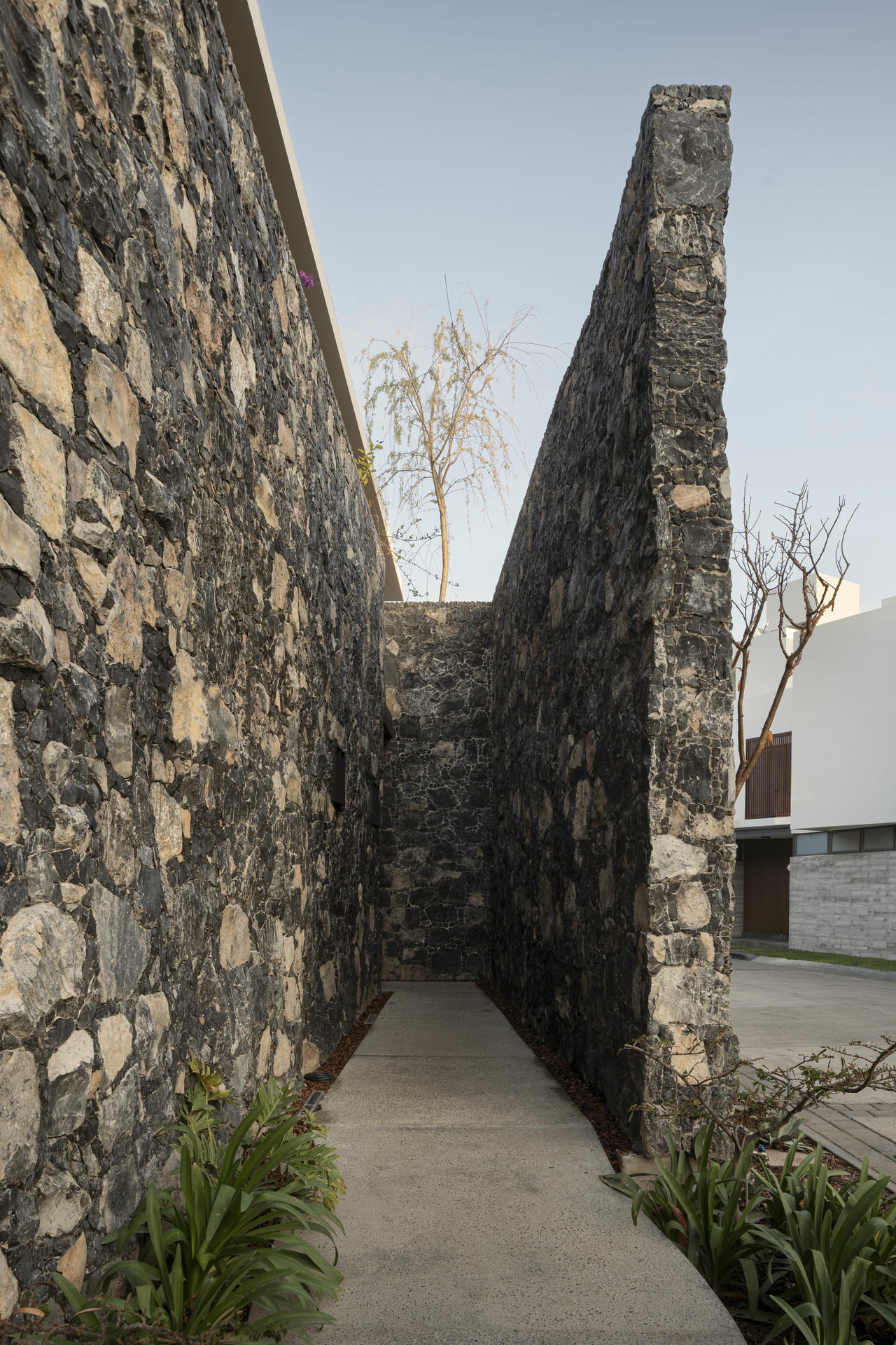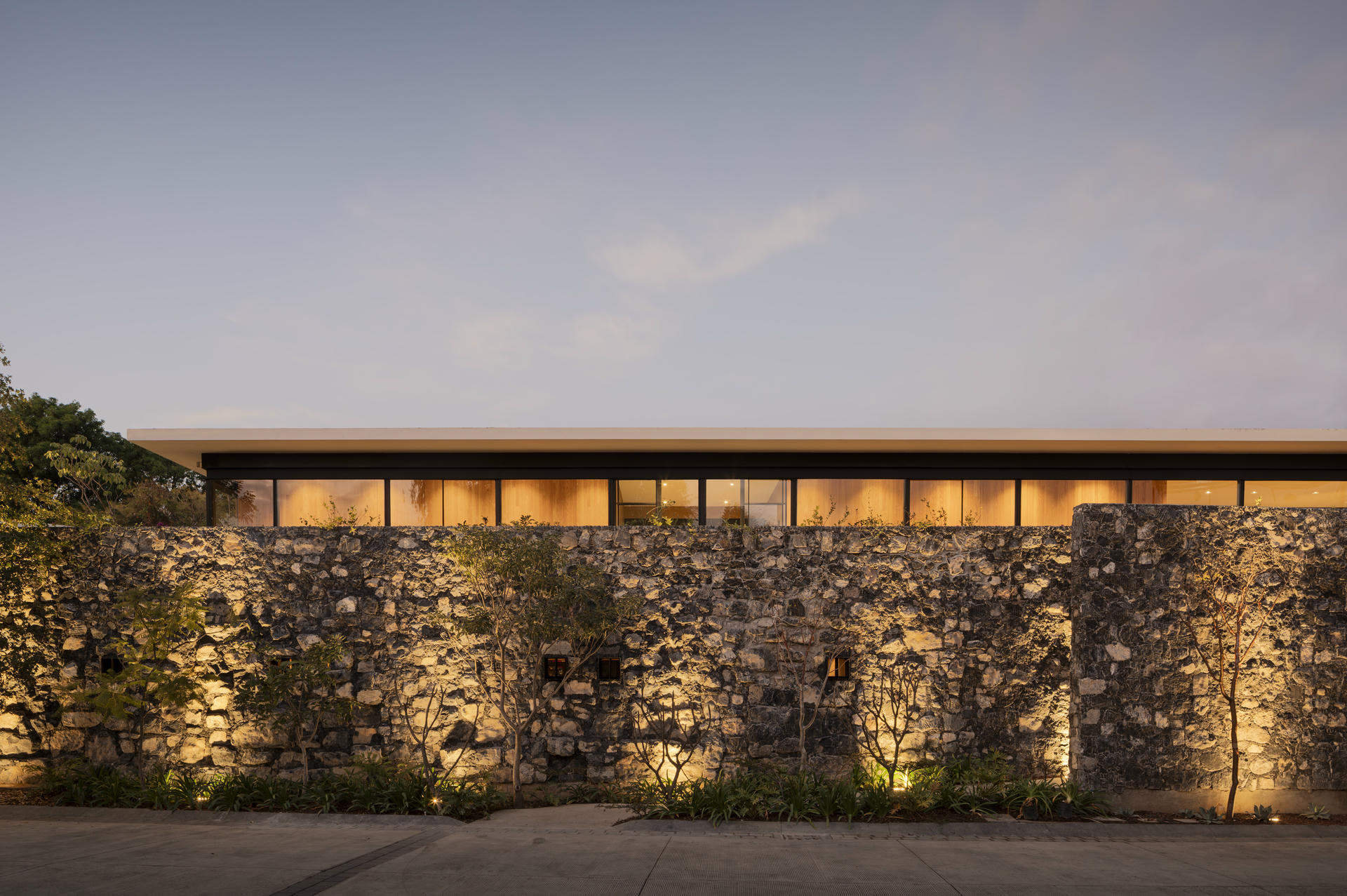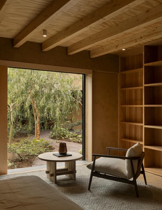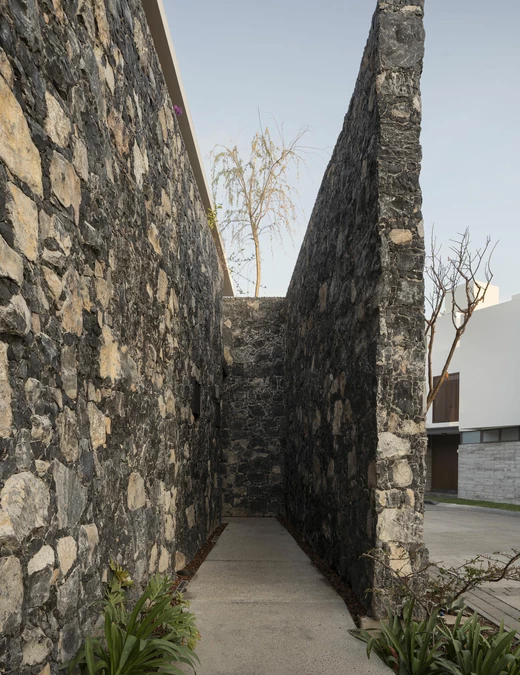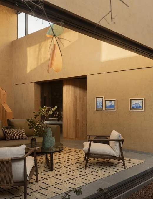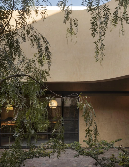 Ogród nie jest tu tylko dekoracją, a organiczną częścią projektu. Otaczają go pirule, agawy, drzewa o czerwonawej korze oraz kaliandry, które wprowadzają ruch, światło i zapach. Roślinność filtruje promienie słońca, kołysze się pod wpływem wiatru, a odgłosy liści i ziemisty aromat świeżo podlanego ogrodu przenikają do wnętrza.