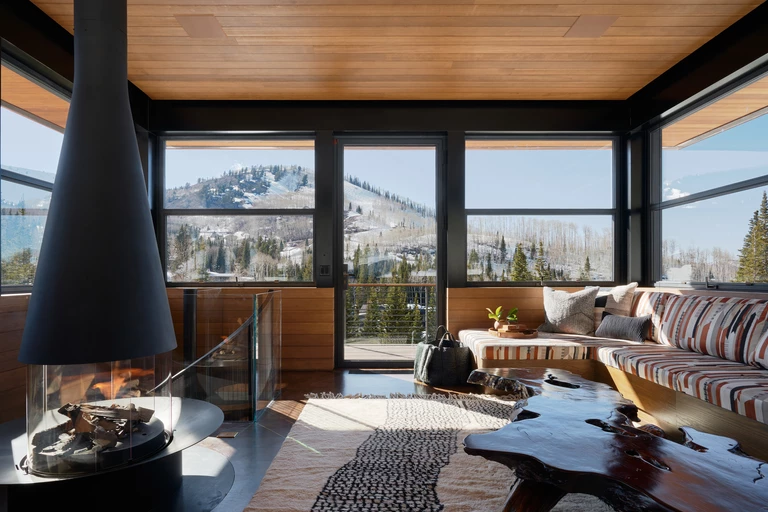 We wnętrzu budynku dominują wyselekcjonowane, wysokiej klasy przedmioty vintage i elementy zaprojektowane na specjalne zamówienie. Podczas pracy nad aranżacją projektanci postawili na naturalne materiały, zwłaszcza drewno, które doskonale komponuje się z zachwycającym górskim krajobrazem. Masywne okna i systemy przesuwania i podnoszenia ścian łączą wnętrze z panoramicznym otoczeniem.
