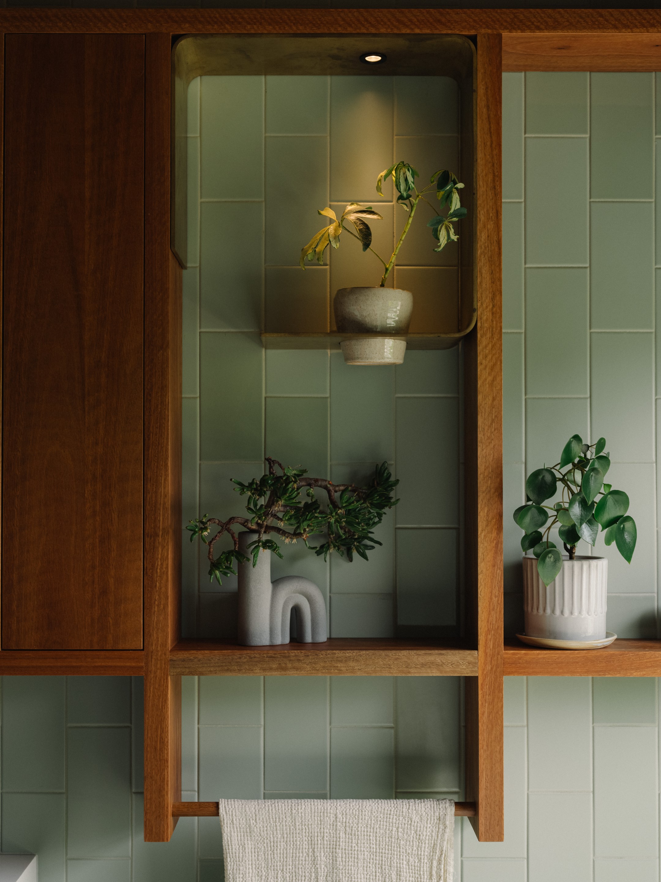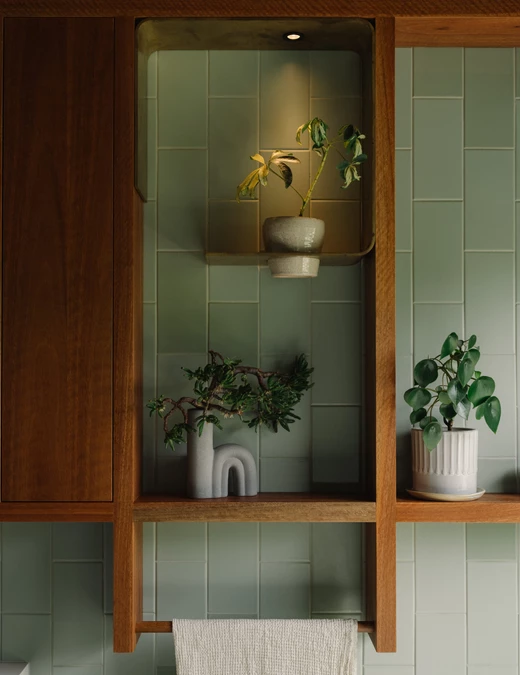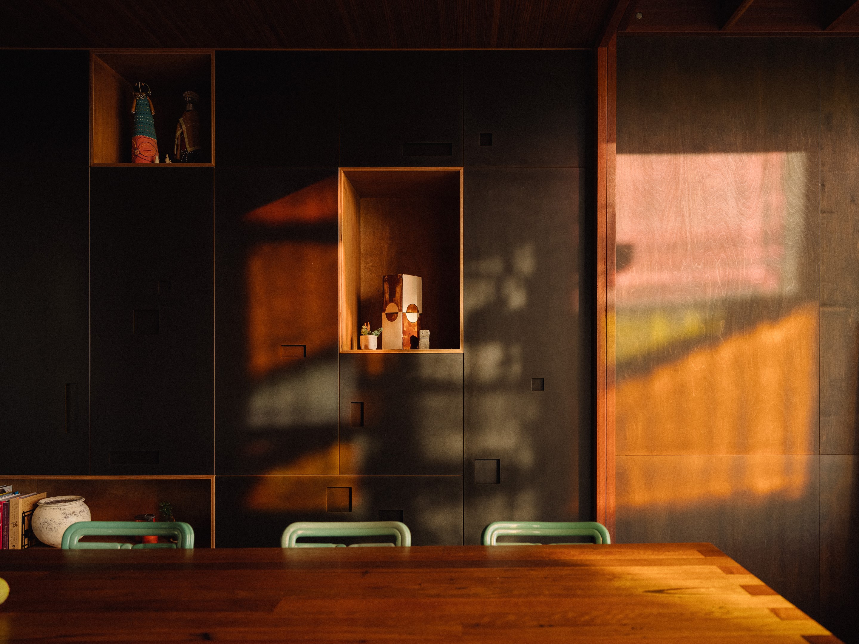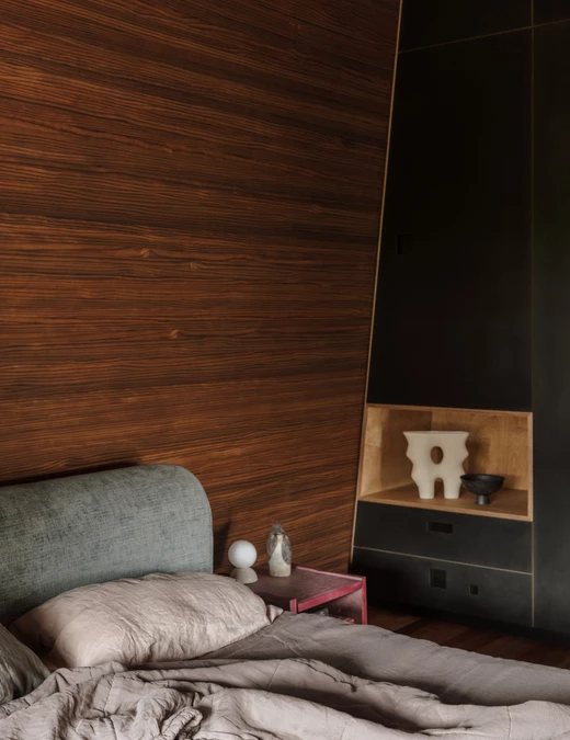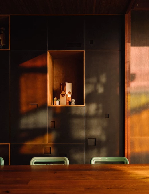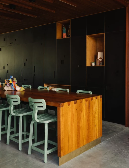 W kuchni centrum stanowi wyspa z lokalnego, recyklingowanego drewna. Zabudowę z przetworzonej masy papierowej i niskoformaldehydowej sklejki ozdabiają perforacje, które imitują charakterystyczną grę światła i cienia tworzącą się pod koronami drzew. Obok znajduje się duża leżanka, stale używana przez domowników.