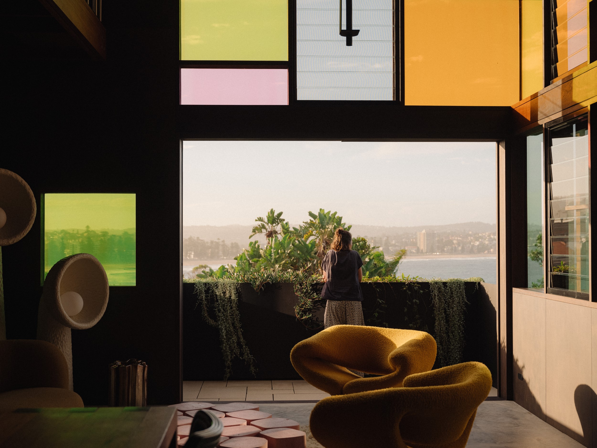 Aby wejść do domu, stąpa się z kamienia na kamień, wspinając się wzdłuż kaskady wodospadu ku przestrzeni mieszkalnej. Powietrze wypełnia szmer wody, a gra świateł i barw powstaje dzięki rozległym, kolorowym, witrażowym oknom w dwupoziomowym salonie.