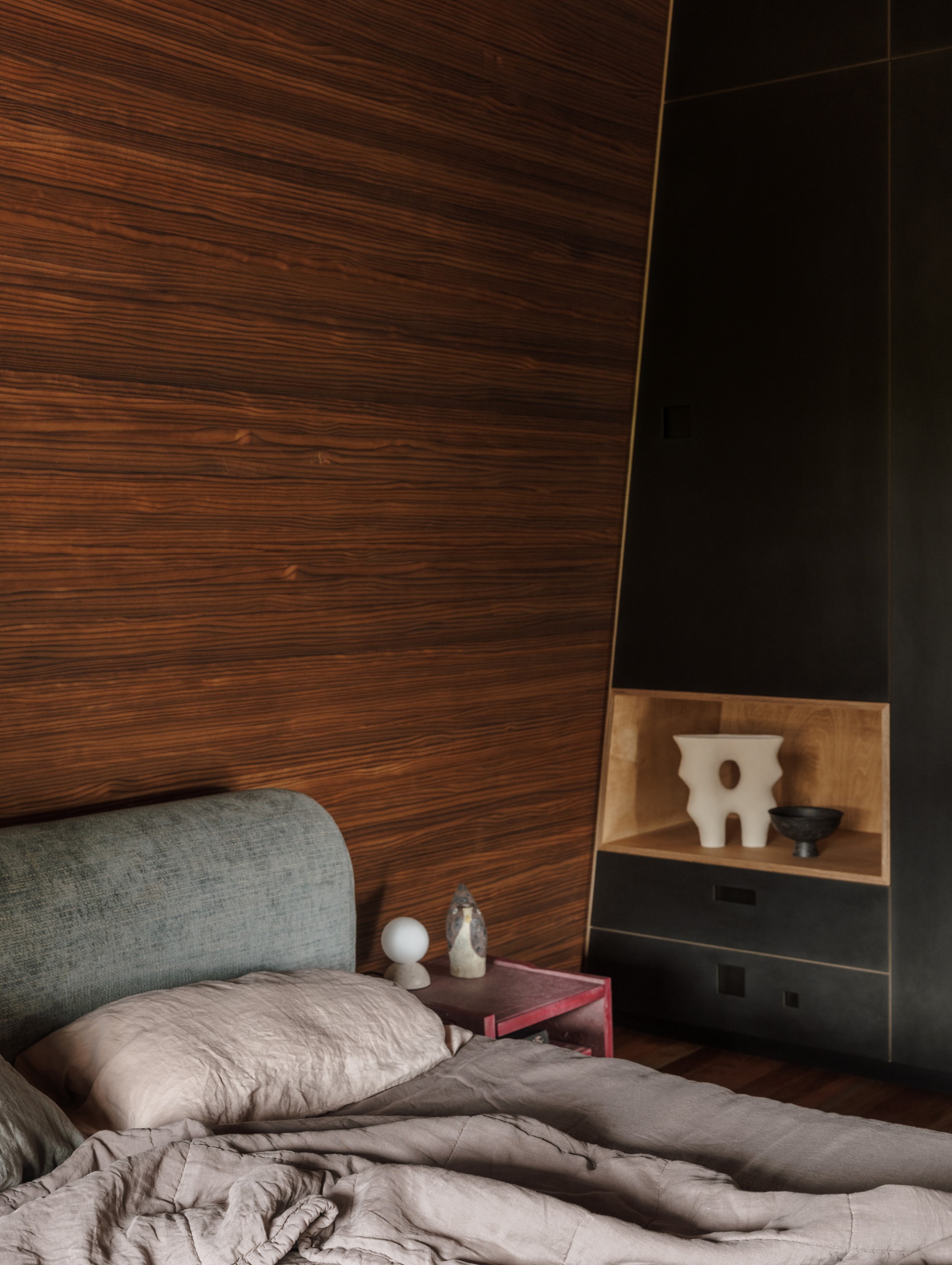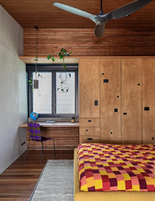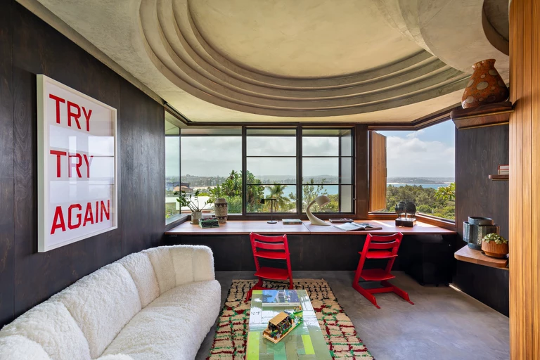 Gabinet znajduje się na pierwszym piętrze, a prowadzi do niego zewnętrzny mostek. Dzięki temu praca jest wyraźnie oddzielona od życia domowego. Z okien rozciąga się panorama oceanu, a zakrzywiona ściana kryje niewielką toaletę. Wieczorem kasetonowy sufit odbija światło z ogrodu dachowego, tworząc delikatną poświatę.