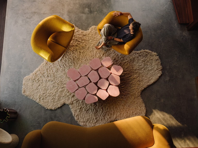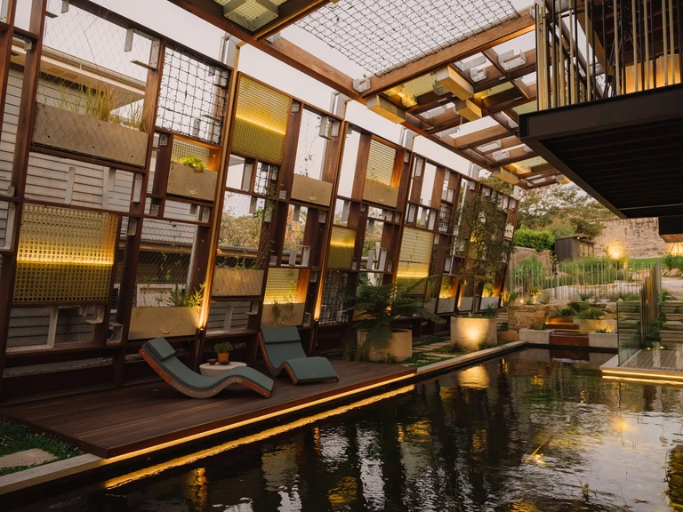 Materiały o niskiej toksyczności, ciemne płytki przy basenie, sufity z drewna Abodo i panele Barestone nadają przestrzeni naturalny charakter. Wiatr i deszcz są tu elementem codziennego doświadczenia.