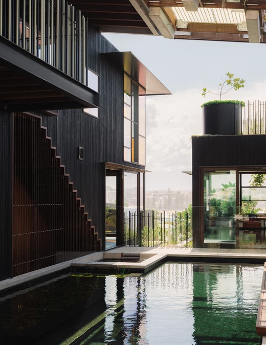 Tak narodził się pomysł, by każde pomieszczenie skupiało się wokół źródła wody. Serce domu stanowi naturalny basen, z którego woda płynie jak strumień w lesie deszczowym, przechodząc przez wnętrza i tarasy. Nad wodą rozciąga się zielony baldachim z roślin, wsparty na strukturze z drewna, stali i półprzezroczystych, jadeitowych paneli.