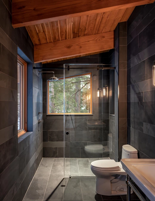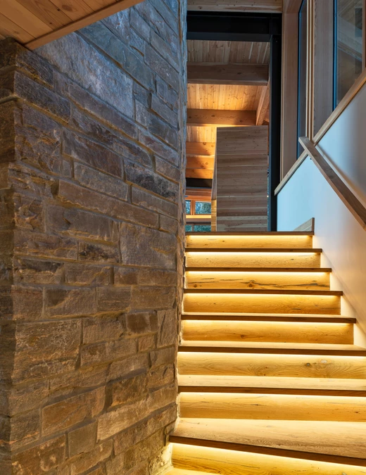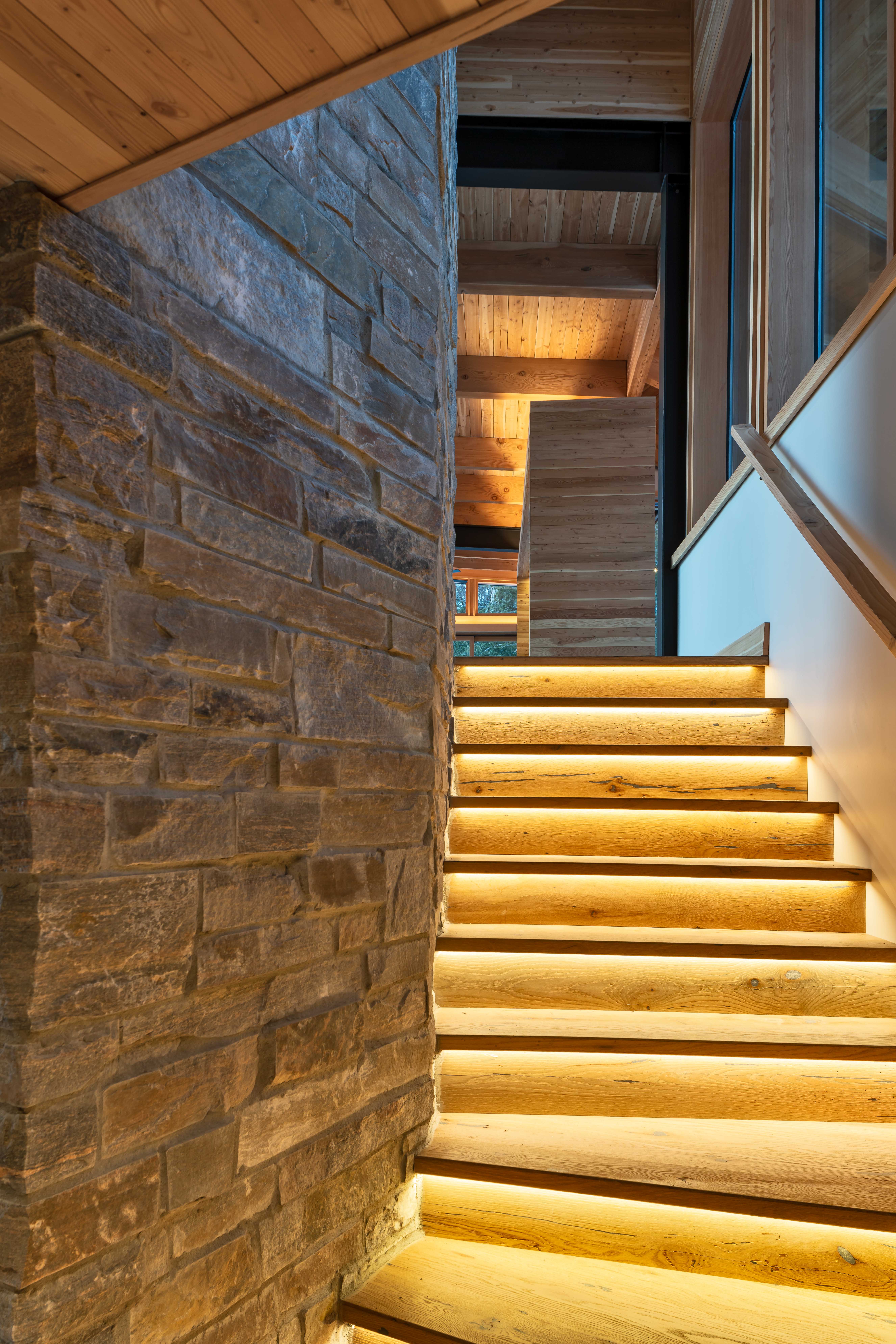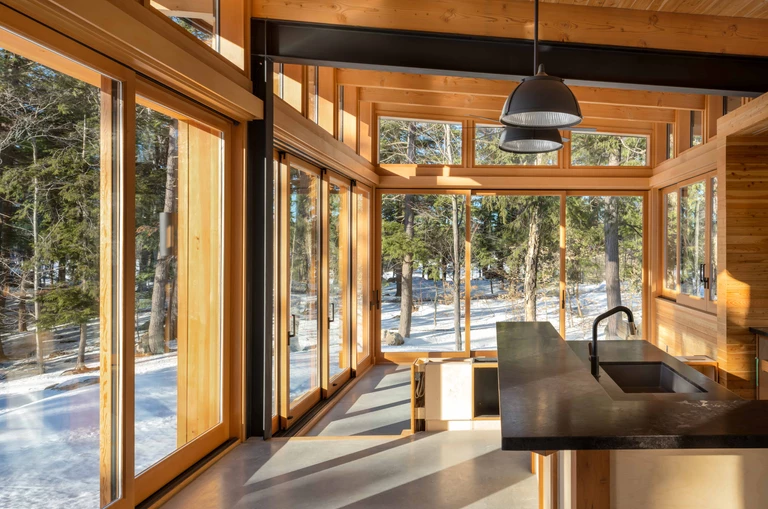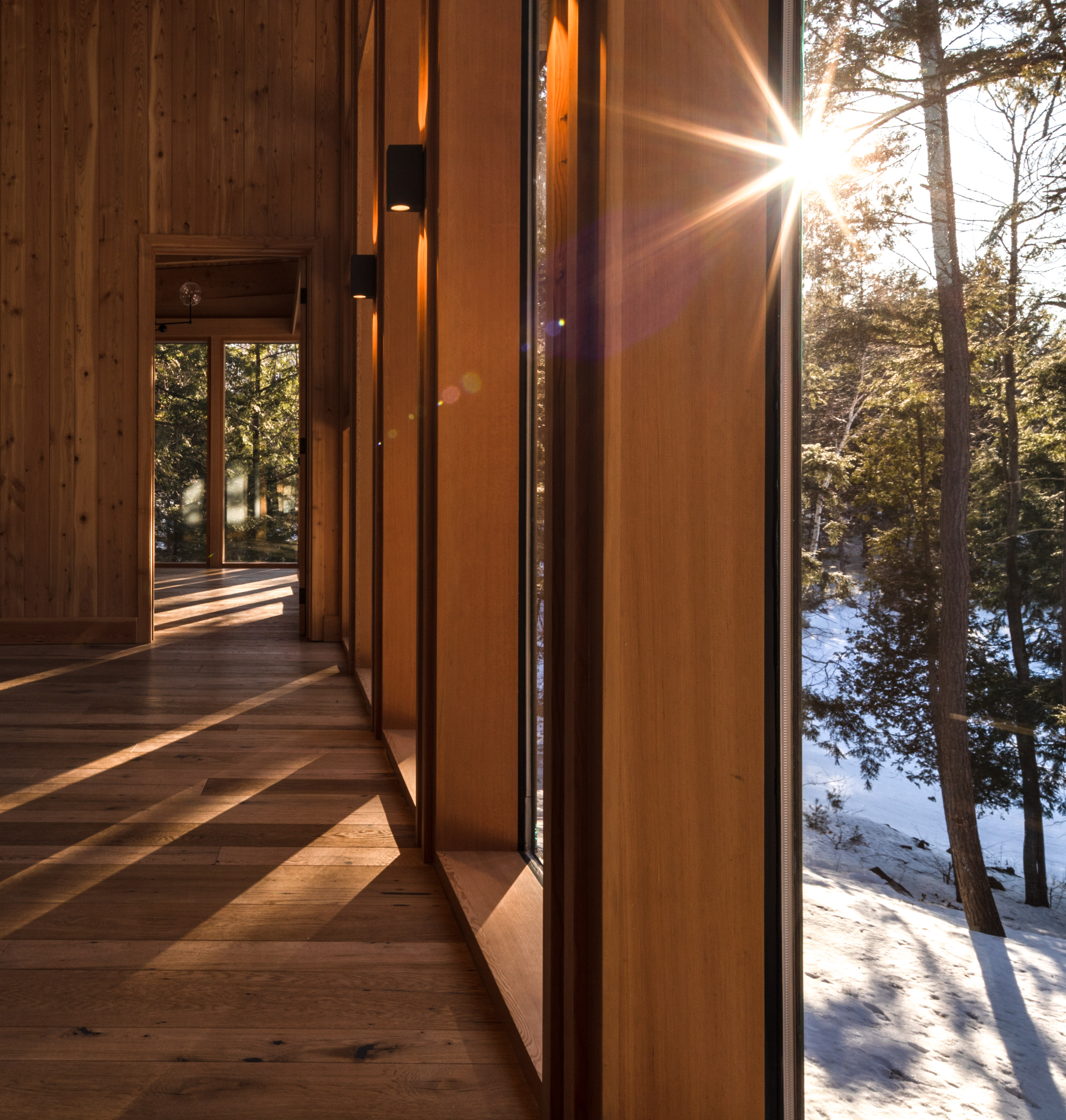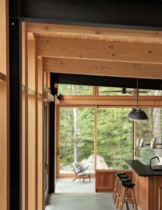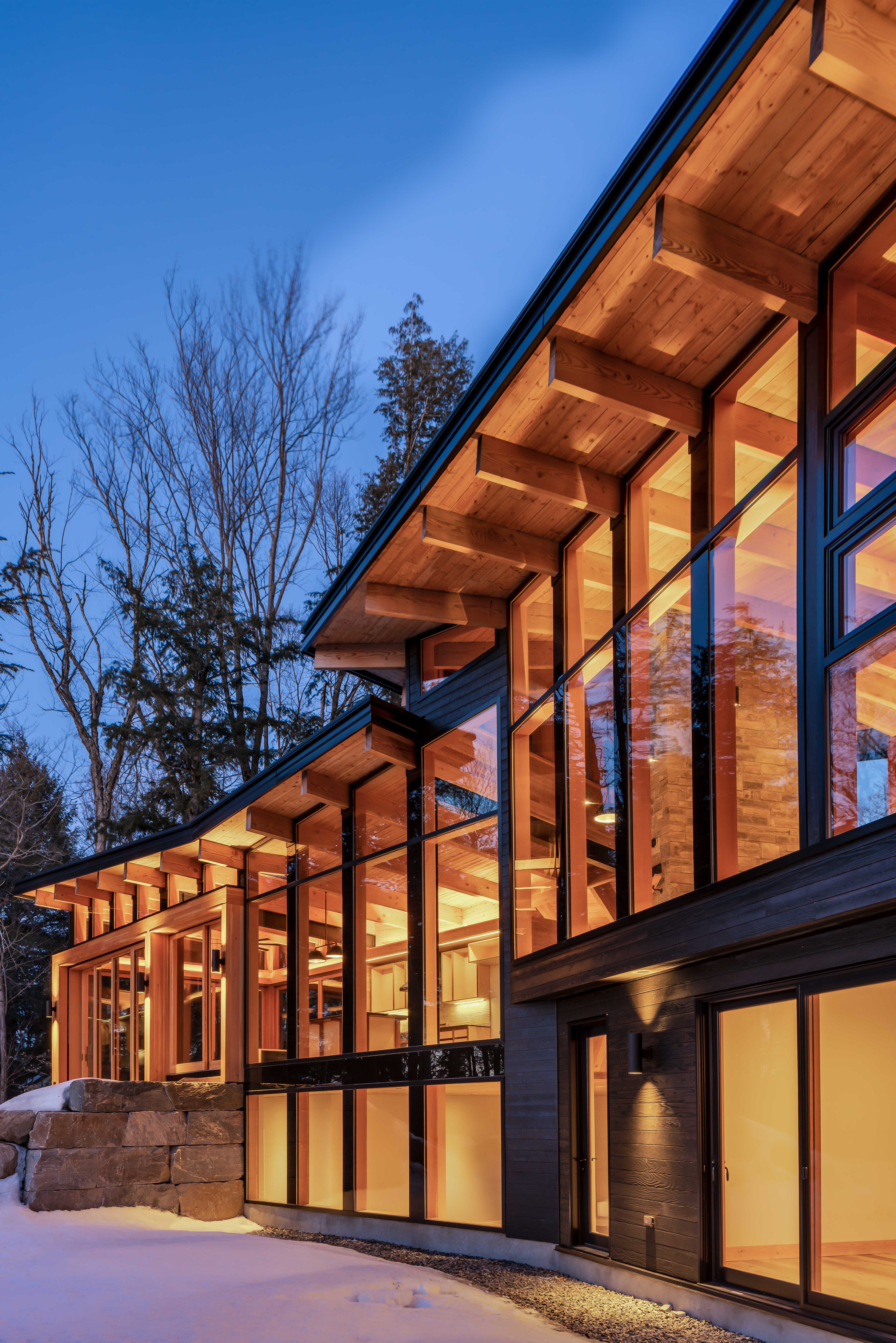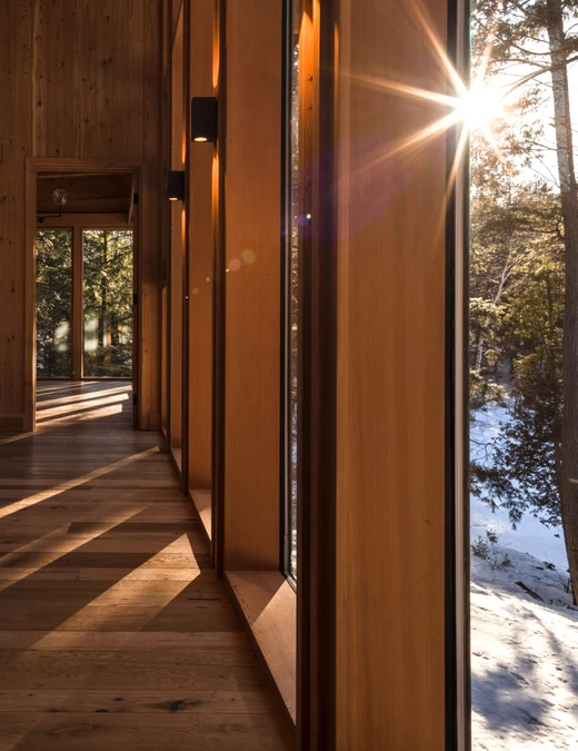 Jednak pomimo swojej otwartości i rozległych przeszkleń domek ma zapewniać prywatność – powstał, by widzieć naturę, a nie być widzianym. Bryła jest osłonięta przez krajobraz, dzięki czemu pozostaje niemal niewidoczna od strony jeziora.