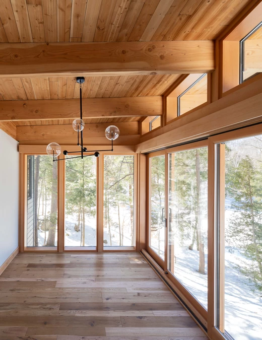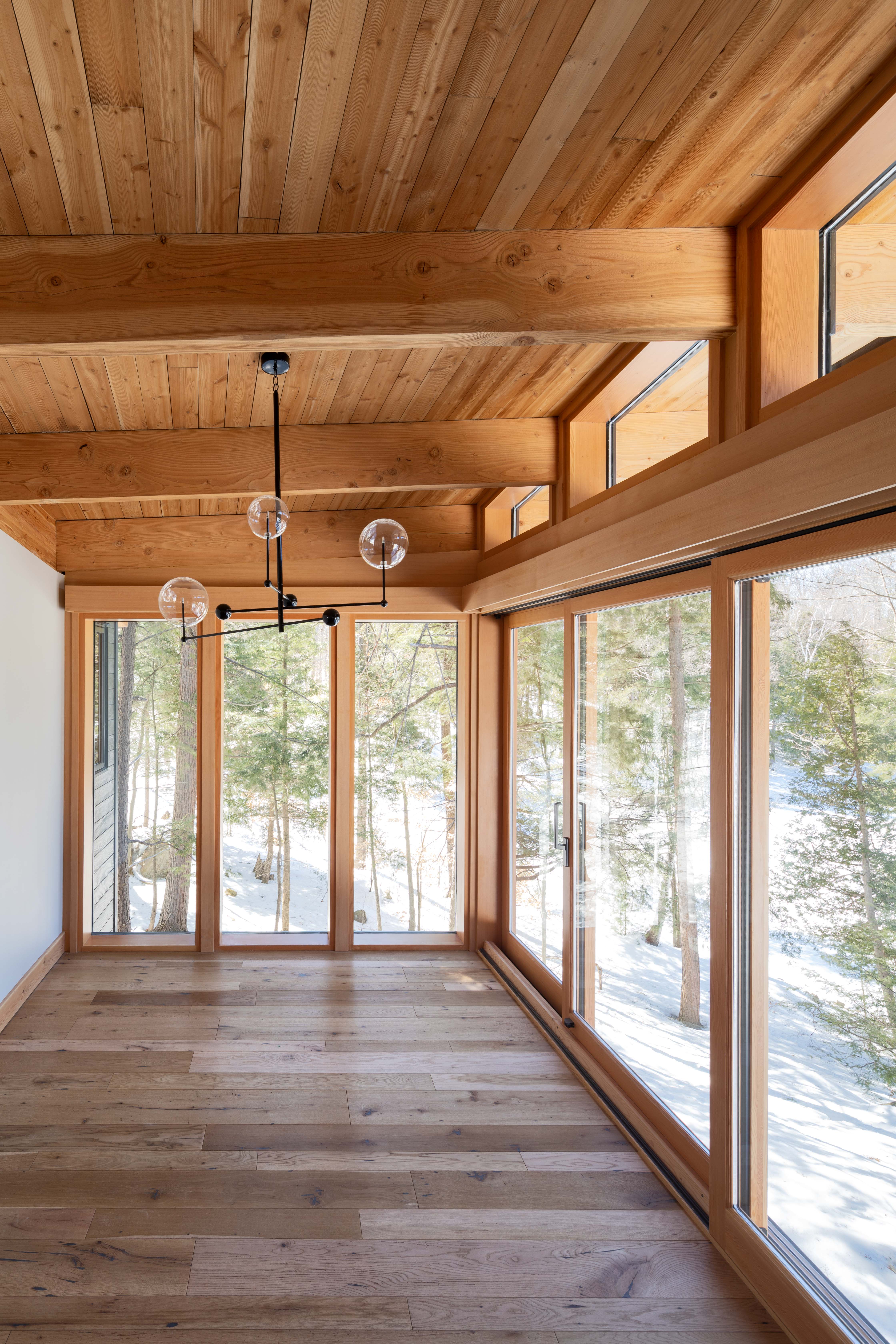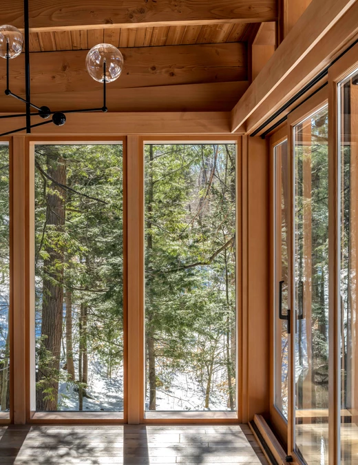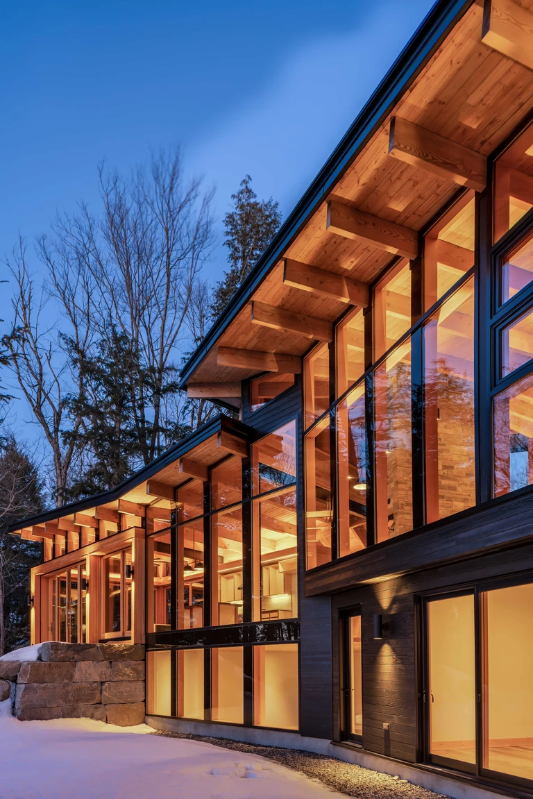 Podążając za słynnym hasłem, my także udajemy się do Barlochan Cottage. Projekt chatki opiera się na maksymalnym otwarciu na otoczenie. Duże przeszklenia, precyzyjnie zintegrowane z konstrukcją słupów i belek, sprawiają, że granica między wnętrzem a kanadyjskim krajobrazem praktycznie zanika. Na tym właśnie zależało inwestorowi – na intymnym współistnieniu budynku z naturą.