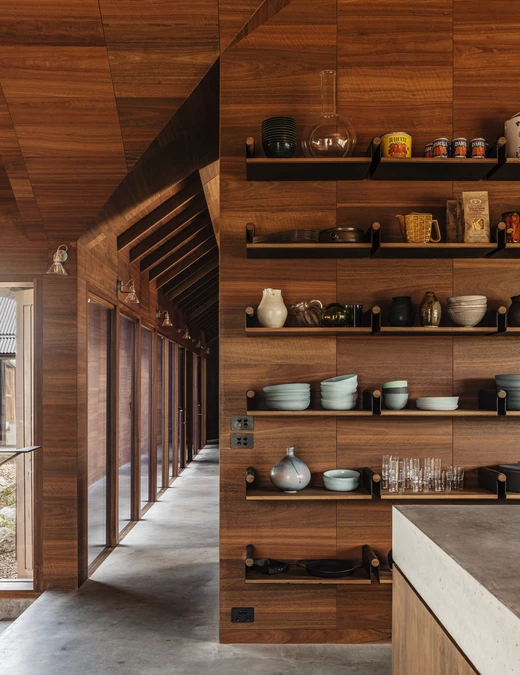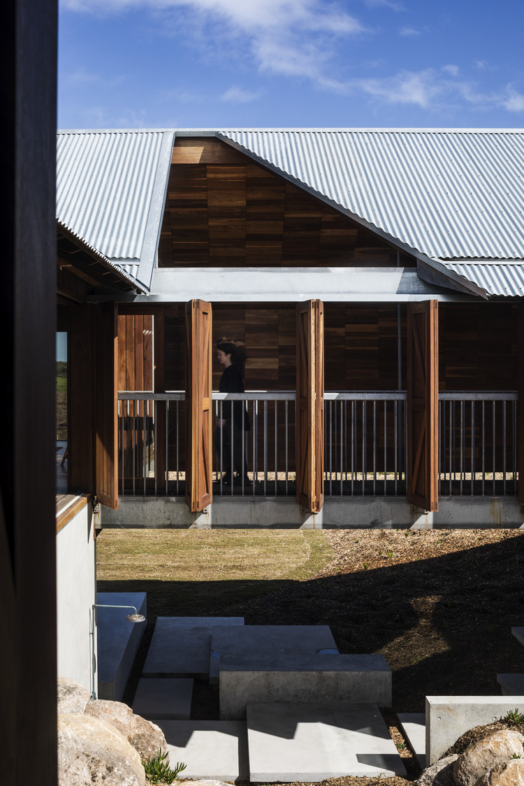 Elewacje wykończone są litym australijskim drewnem, a dach blachą ocynkowaną – oba te materiały wskazują na silny związek z lokalną architekturą wiejską.