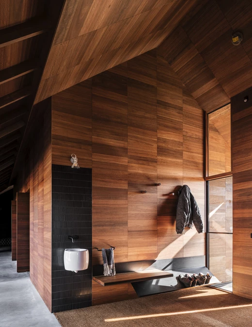 Wnętrza domu charakteryzuje konsekwentnie ograniczona paleta materiałów. Drewno dominuje na podłogach, ścianach i sufitach, nadając przestrzeni ciepło i spójność. Towarzyszą mu czerniona stal oraz szkliwione płytki, które budują subtelny kontrast. Rytm powtarzalnych elementów, niskie kinkiety i oszczędne detale nadają wnętrzom minimalistyczny charakter.