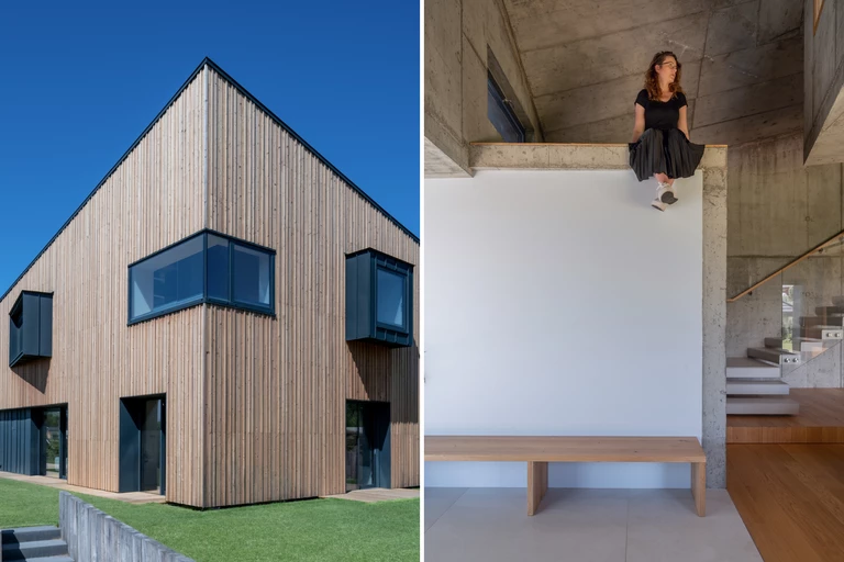W całości wykonany z betonowych elementów budynek pokrywa elewacja z drewna i grafitowej blachy. Asymetryczny kształt bryły stał się jednym z elementów charakterystycznych projektu. Asymetryczne jest także rozmieszczenie okien. Architekt bawi się ich rozmiarem, kształtem i osadzeniem – niektóre zamontowano standardowo, a inne w formie wykuszu.