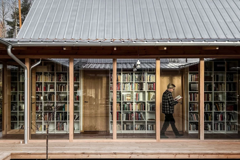 Kto czyta książki, żyje podwójnie – pisał Umberto Eco. Właściciele tego domu zapracowali na bardzo wiele żyć. To pokaźna, domowa biblioteka stała się centralnym punktem projektu. Wokół niej zarysowano oś budynku, a książki sprawiły, że wszelkie dekoracje we wnętrzu są już zbędne.