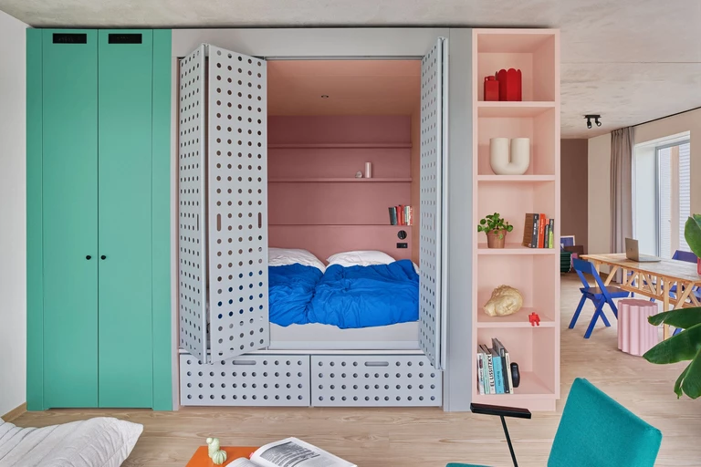 Apartamenty wyposażano w wielofunkcyjne moduły. Ich centralna lokalizacja aranżuje przestrzeń kompaktowych mieszkań. W każdym z modułów mieszczą się zabudowa kuchenna, miejsce do przechowywania i łóżko w alkowie. Architekci funkcje poszczególnych części modułów podkreślili różnymi kolorami.