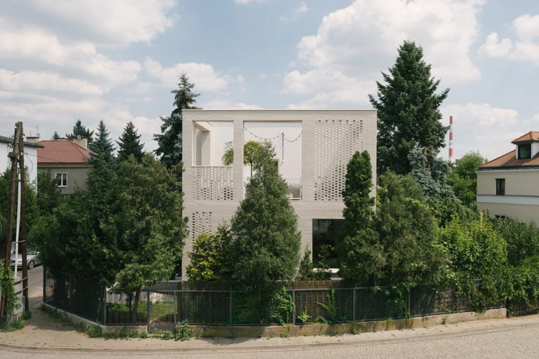 Architekci z pracowni Studio Wajda stworzyli elewację z elementów o różnych fakturach, wszystkie są jednak utrzymane w białej kolorystyce. Dekoracyjnym detalem są balustrady z ażurowej stali malowanej proszkowo na biało.