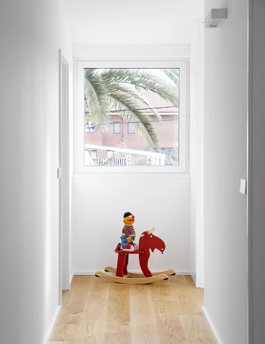 Na piętrze znajdują się cztery sypialnie. Łączące je długie okno łamie się w kształt litery „L”, podążając za kształtem bryły budynku. Unoszący się nad oknem baldachim latem doskonale chroni przed słońcem. To stąd roztacza się przepiękny widok na pobliski park.
