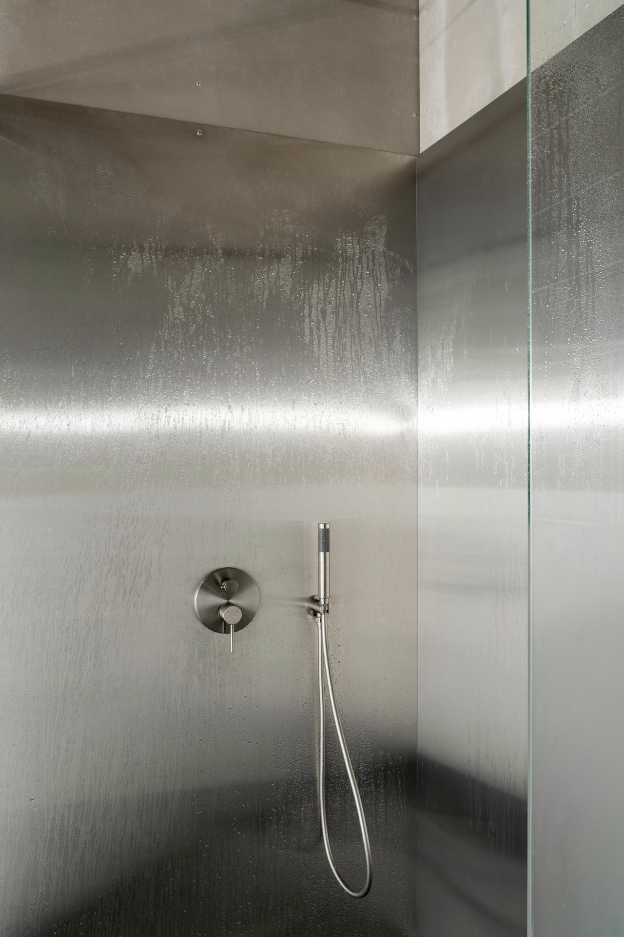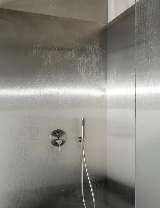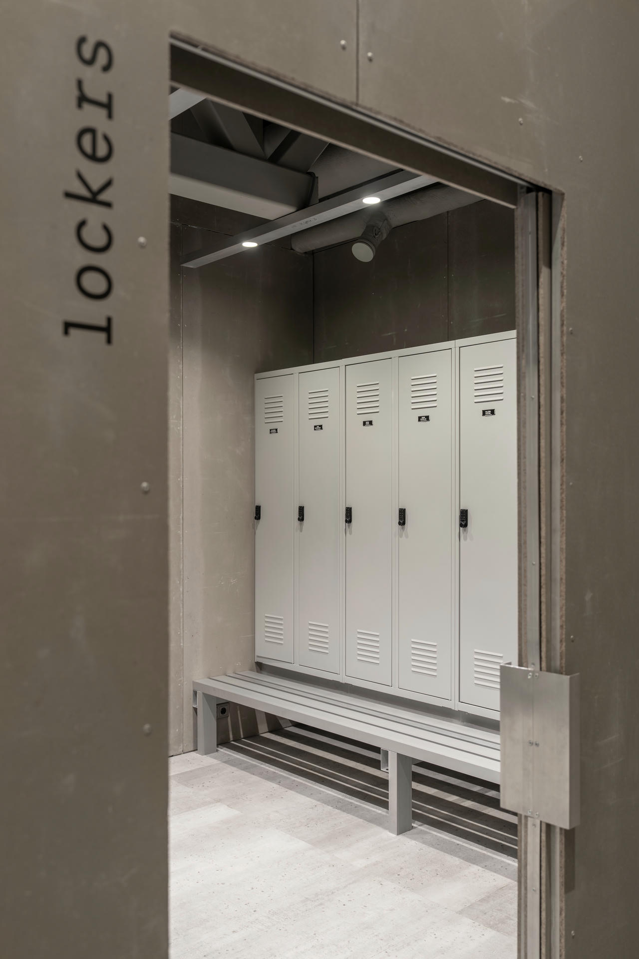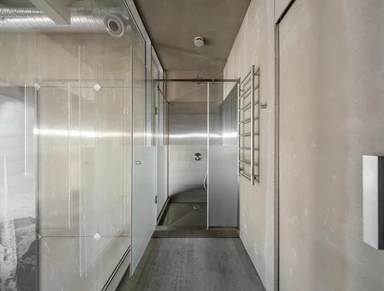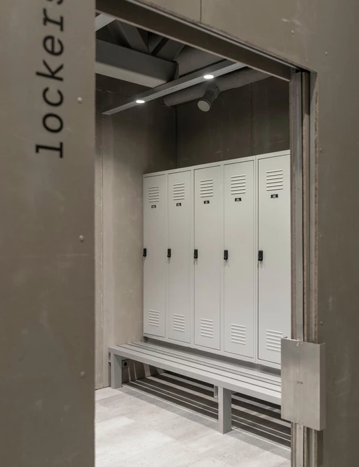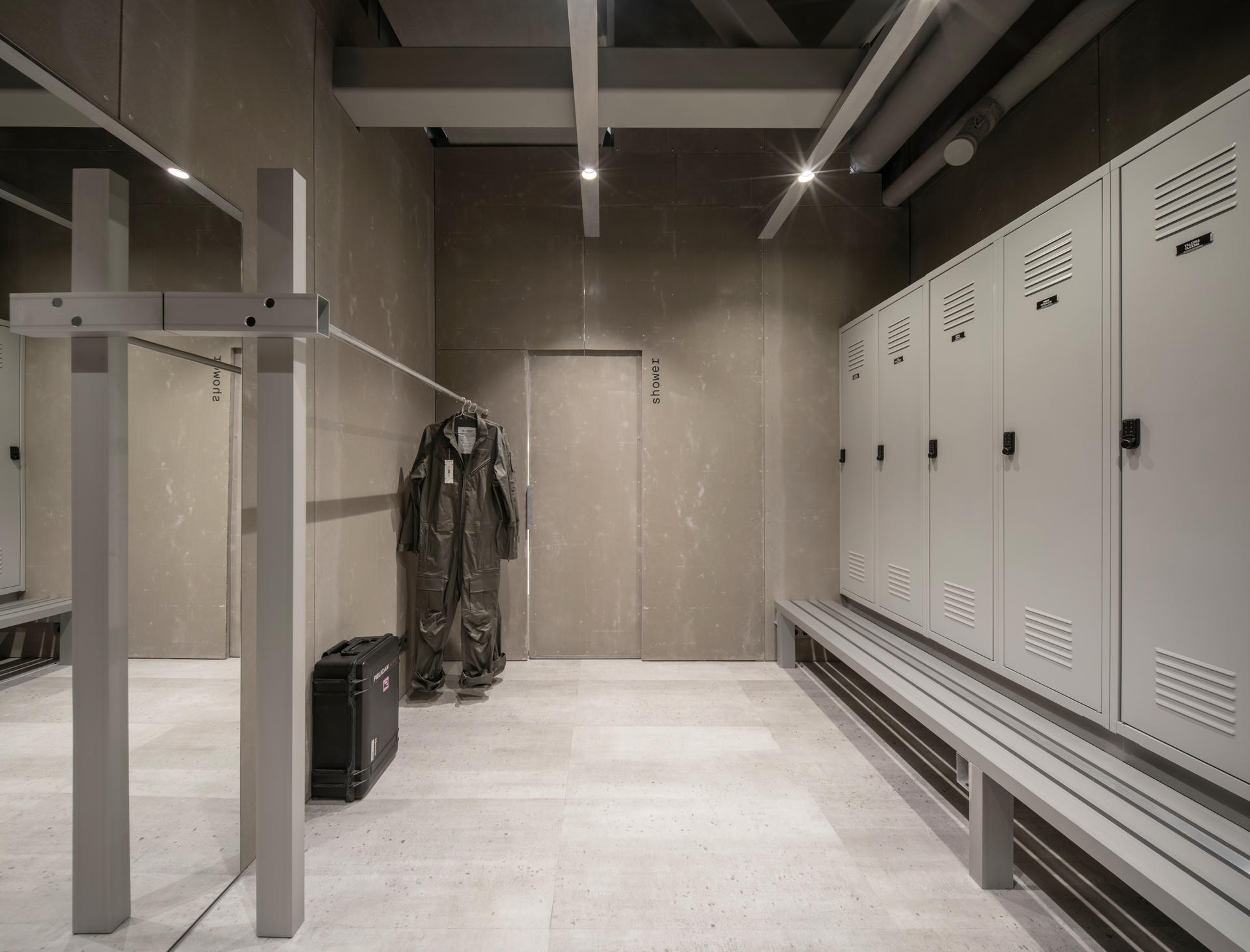 Szatnia płynnie przechodzi w strefę prysznicową. Elementy wyposażenia wykonano z aluminium i stali nierdzewnej. Jednym z najodważniejszych rozwiązań, w pełni popartym przez grupę AEROTIM, jest okno łączące prysznice z główną halą hangaru.
