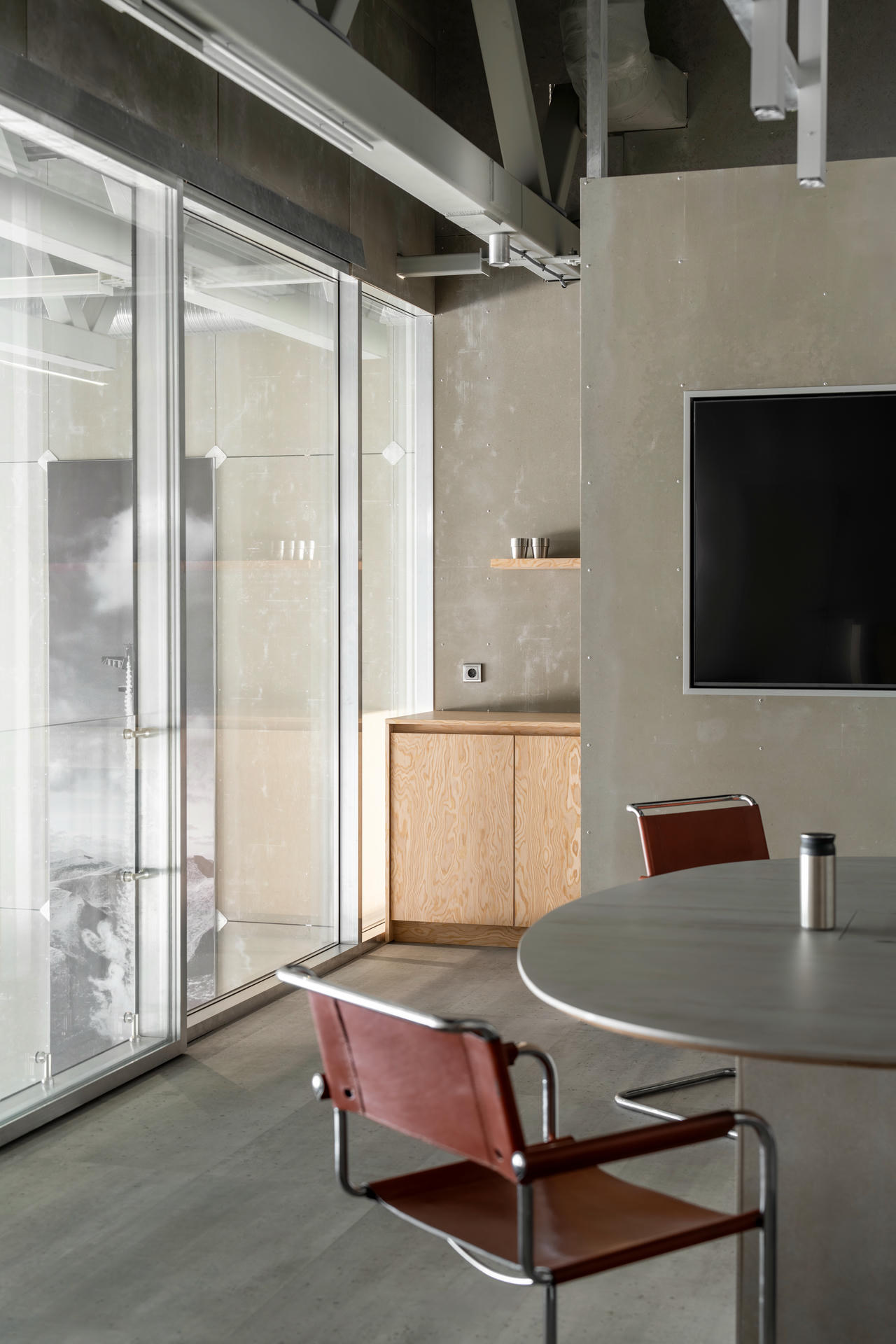 Surowość materiałów równoważą ciepłe akcenty: drewniane fronty kuchenne, detale meblowe oraz czerwono-brązowy odcień pojawiający się w tapicerce. Nowoczesne sofy zestawiono z krzesłami vintage. Starannie dobrany system audio wynika z zamiłowania Timura Fatkullina do muzyki.