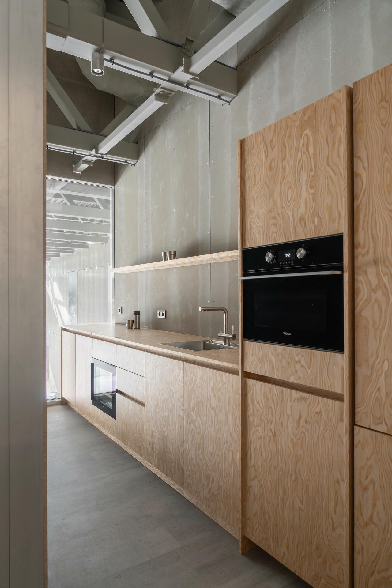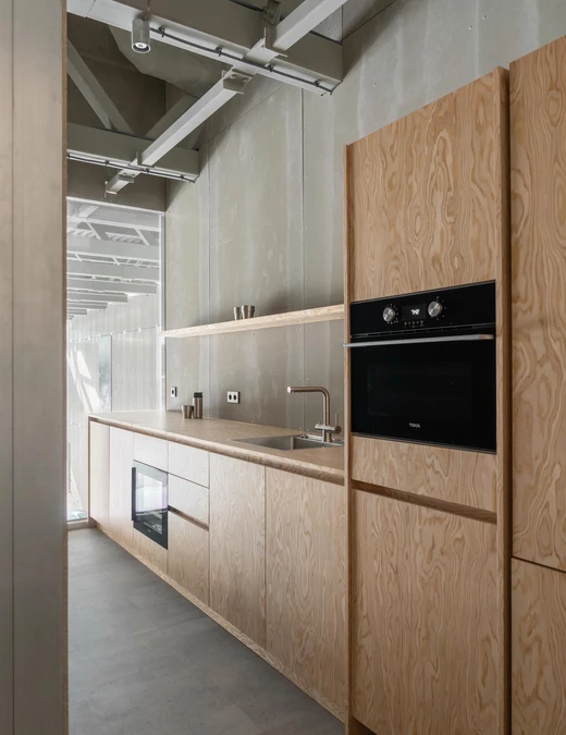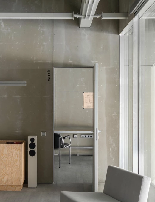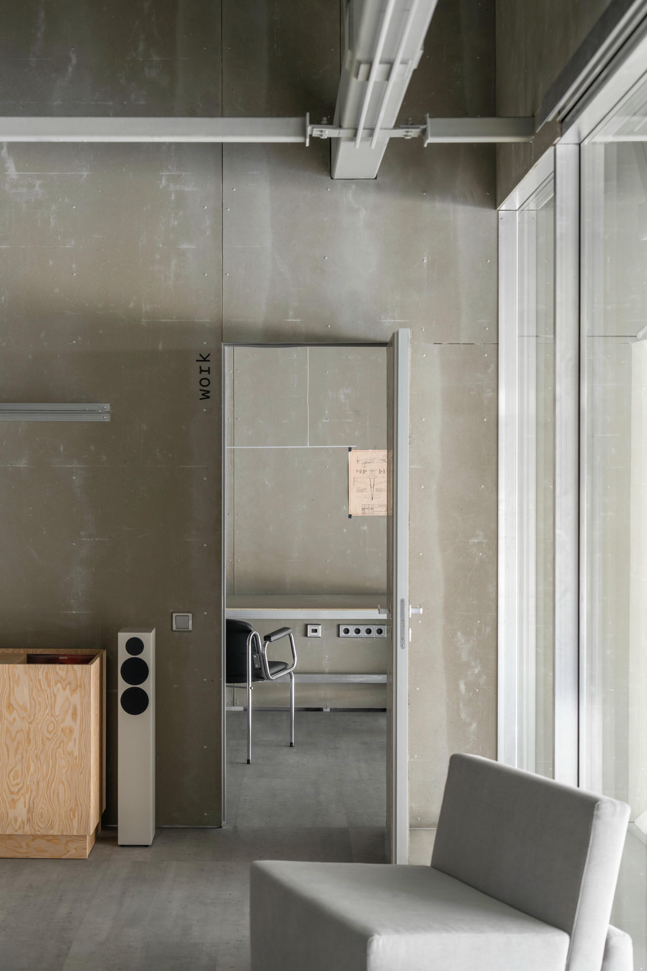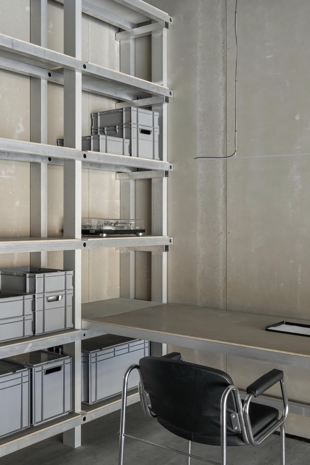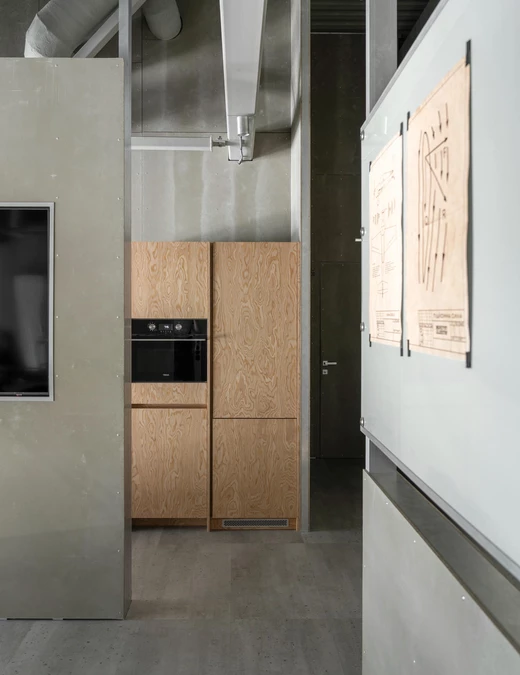 Dla zachowania spójności te same płyty wykorzystano również w drzwiach, stołach roboczych oraz regałach.