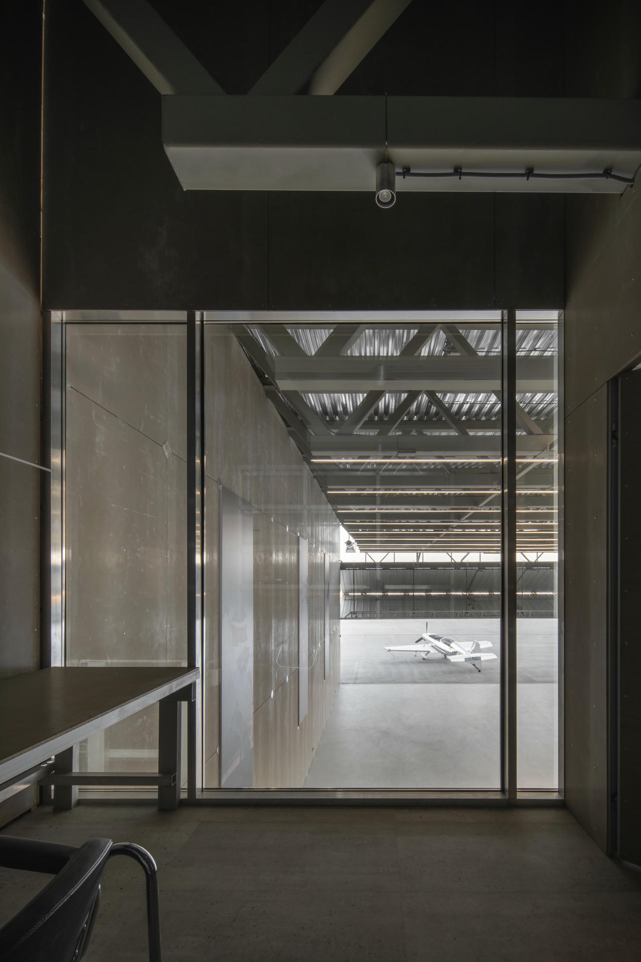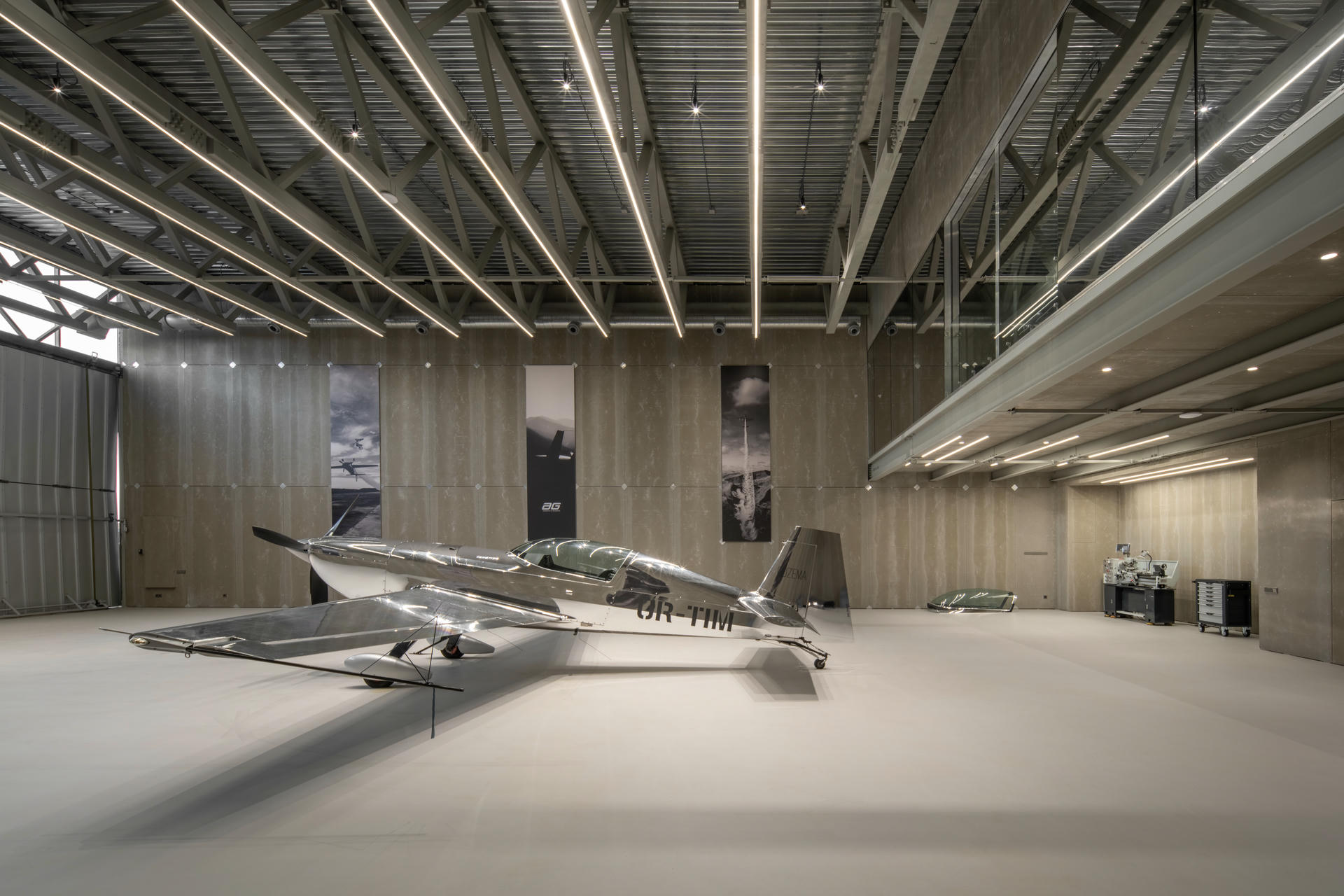 Hangar zamknięto w jednorodnej bryle, mieszczącej strefy napraw i konserwacji, magazyn oraz zaplecze dla załogi o powierzchni 95 m² na drugiej kondygnacji. Sercem obiektu naturalnie stała się hala hangarowa o pełnej wysokości budynku. Konstrukcję celowo odsłonięto: stalowe kratownice, falista blacha dachowa oraz widoczne instalacje techniczne są integralną częścią aranżacji. Architektura nie udaje tu tego, czym nie jest.