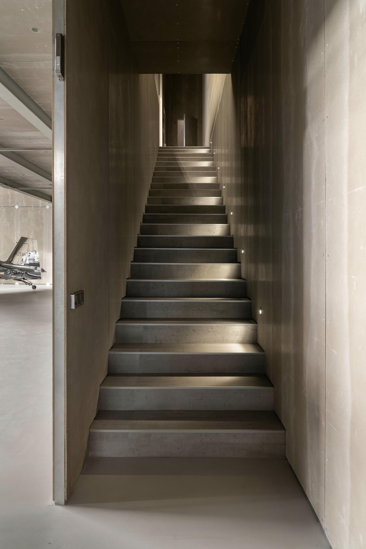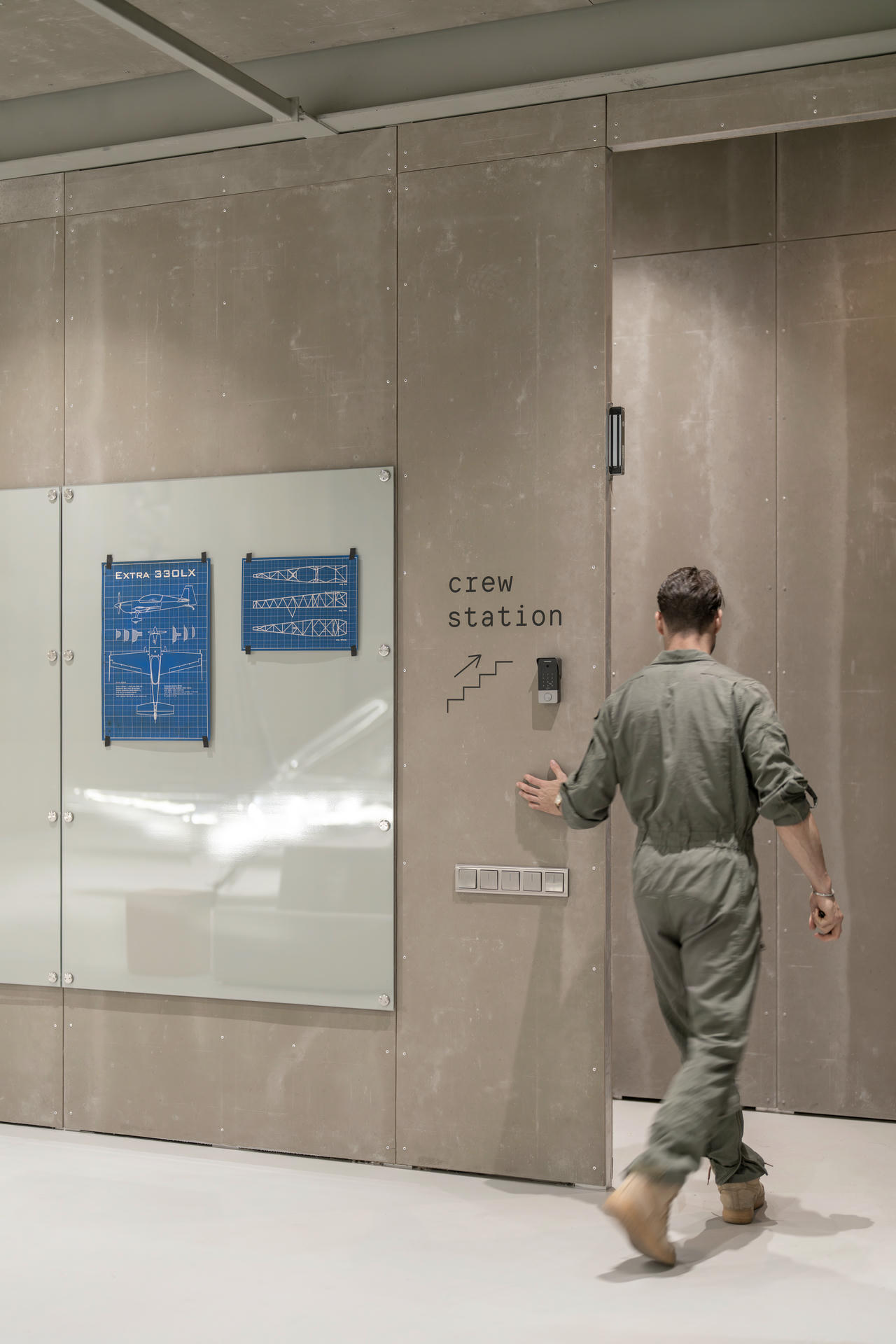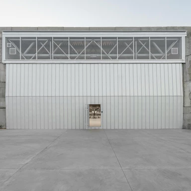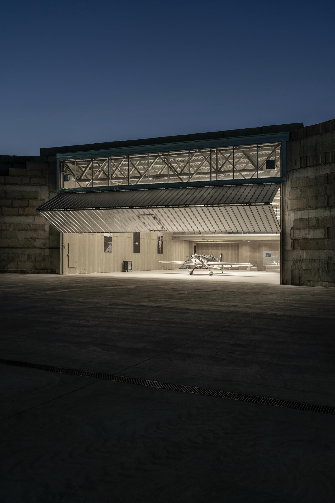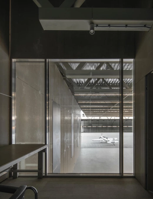 Główne wejście prowadzi przez bramę unoszącą się pionowo. Jej skala i mechanika pozwalają na swobodny ruch samolotów oraz tworzą wizualne połączenie pomiędzy wnętrzem a zewnętrznym pasem operacyjnym.