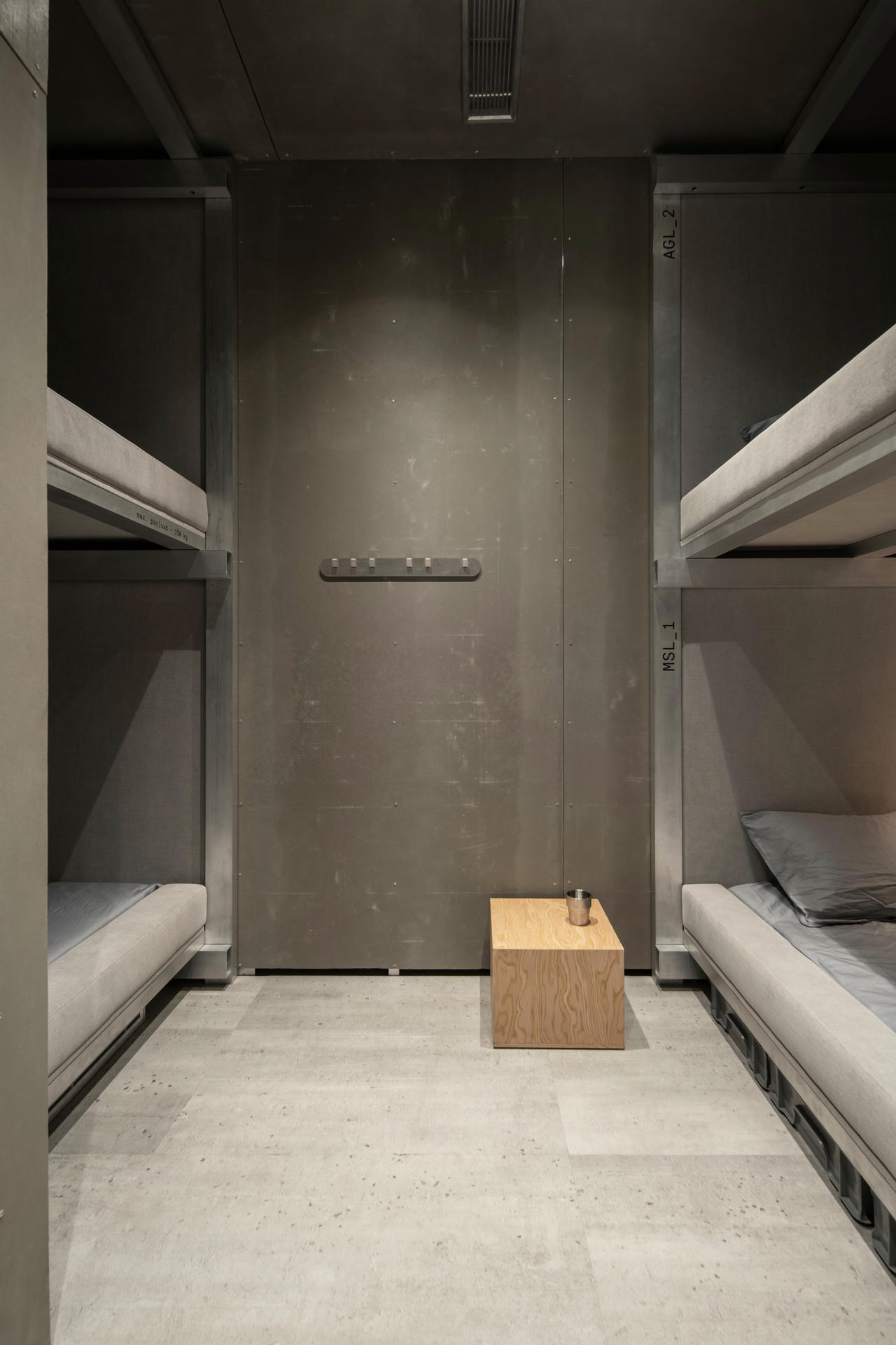 Ze względu na uwarunkowania konstrukcyjne ściany wykończono panelami z cementowo-wiórowych płyt CBPB. Materiał ten jest trwały, a jednocześnie umożliwia szybką wymianę pojedynczych elementów, co jest niezwykle ważne w budynkach tak intensywnie eksploatowanych. Połączenia pomiędzy panelami są celowo widoczne i nawiązują do nitowania kadłubów samolotów.