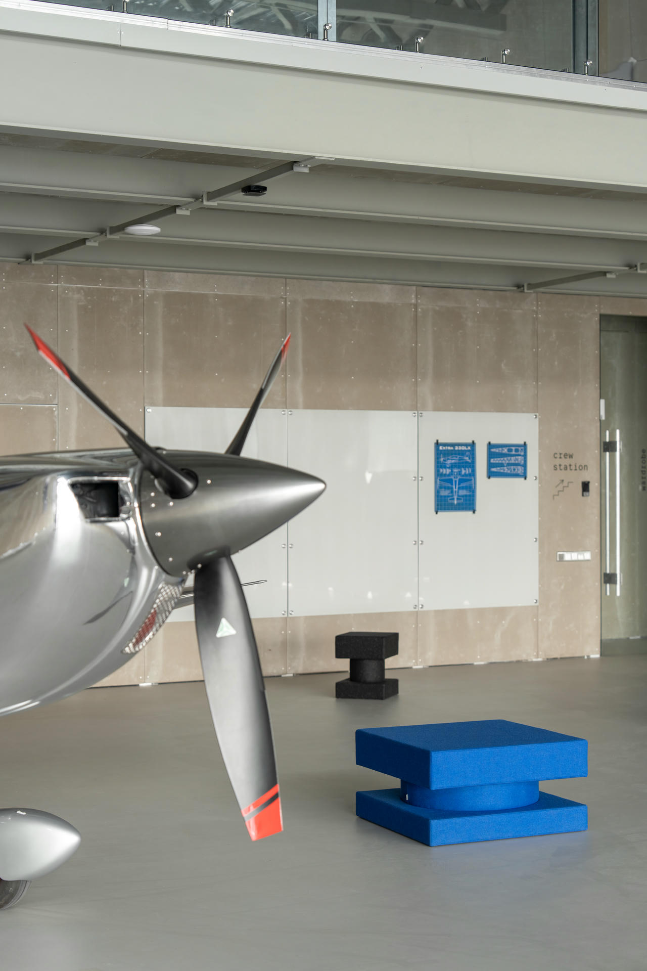 Crew Station na drugim piętrze pełni funkcję punktu obserwacyjnego zawieszonego nad centrum operacyjnym. Zastosowane bezramowe przeszklenie otwiera panoramiczny widok na cały hangar.