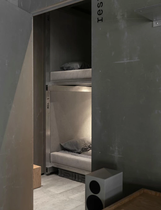 Zaplecze zorganizowano wokół stołu przeznaczonego do spotkań i grupowych dyskusji. Szklane tablice ścienne wspierają codzienną organizację pracy – planowanie lotów, harmonogramy serwisowe, notatki techniczne i szkice. W bezpośrednim sąsiedztwie znajdują się strefy pracy, wypoczynku, snu, kuchnia oraz zaplecze sanitarne. Każda z przestrzeni jest wyraźnie wydzielona, ale mimo to pomieszczenia pozostają ze sobą wizualnie połączone.