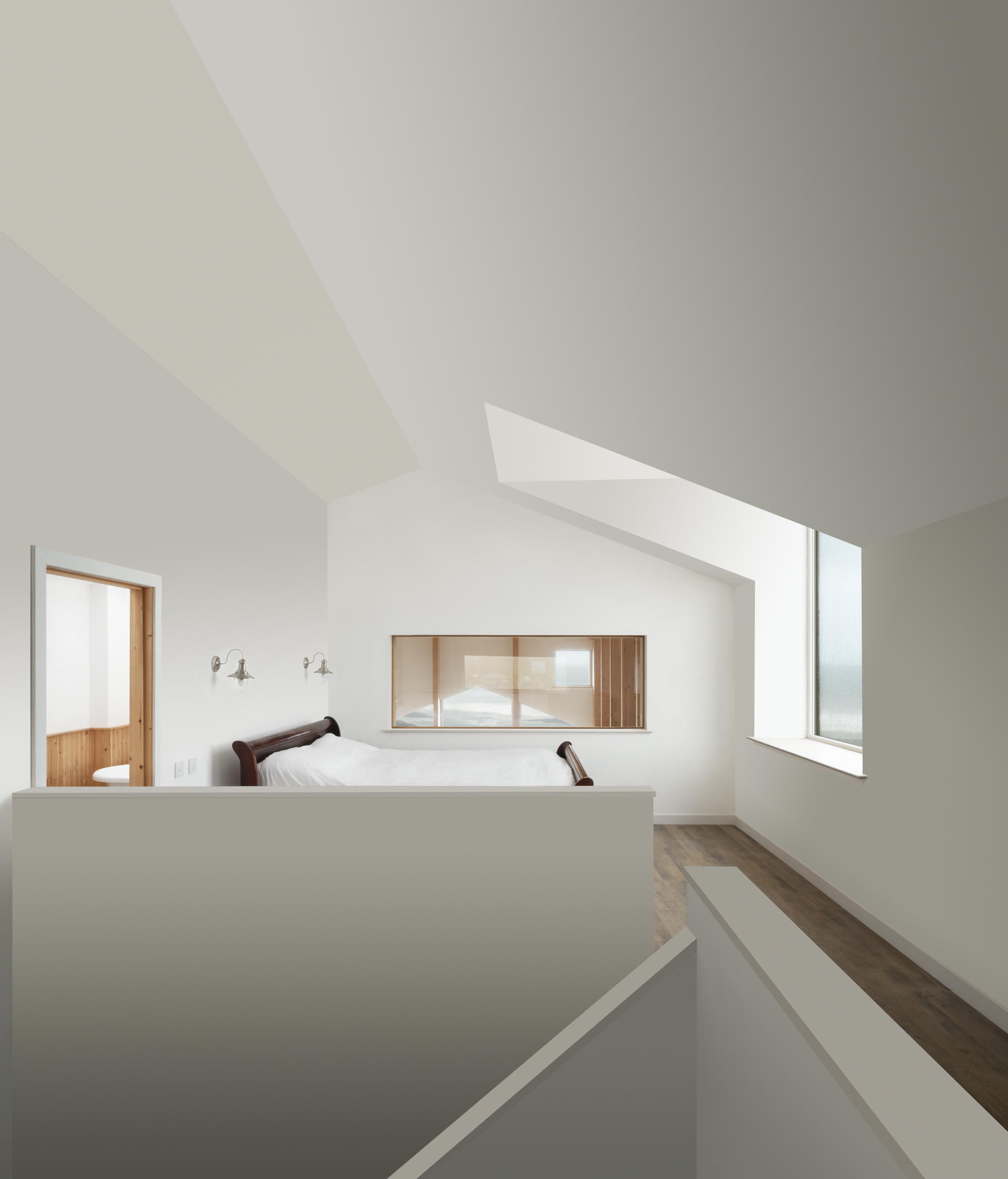 Drugie skrzydło, ustawione pod kątem prostym, zawiera trzy sypialnie i dwie łazienki. Pomieszczenia te otwierają się na wschód i morze, a delikatnie zakrzywione sufity nadają im miękkości i kontrastują z prostą linią dachu.