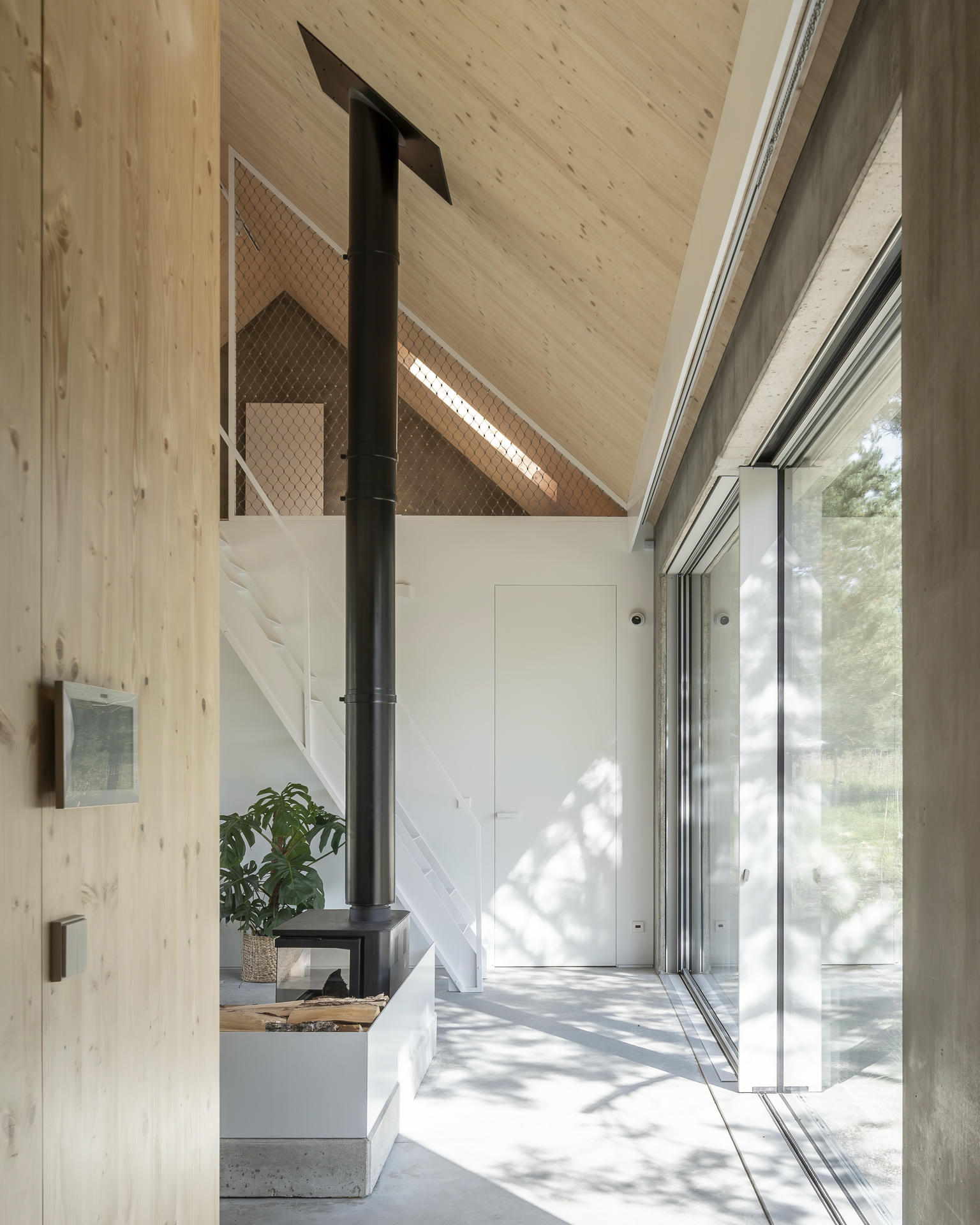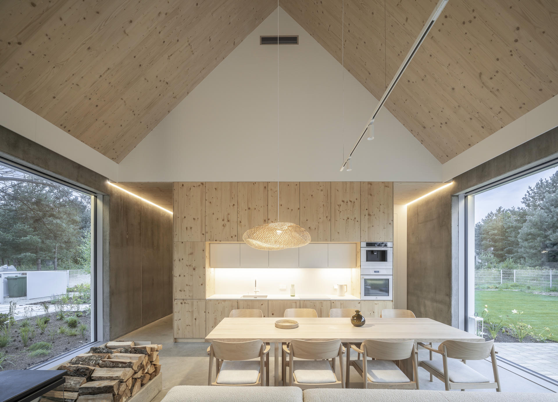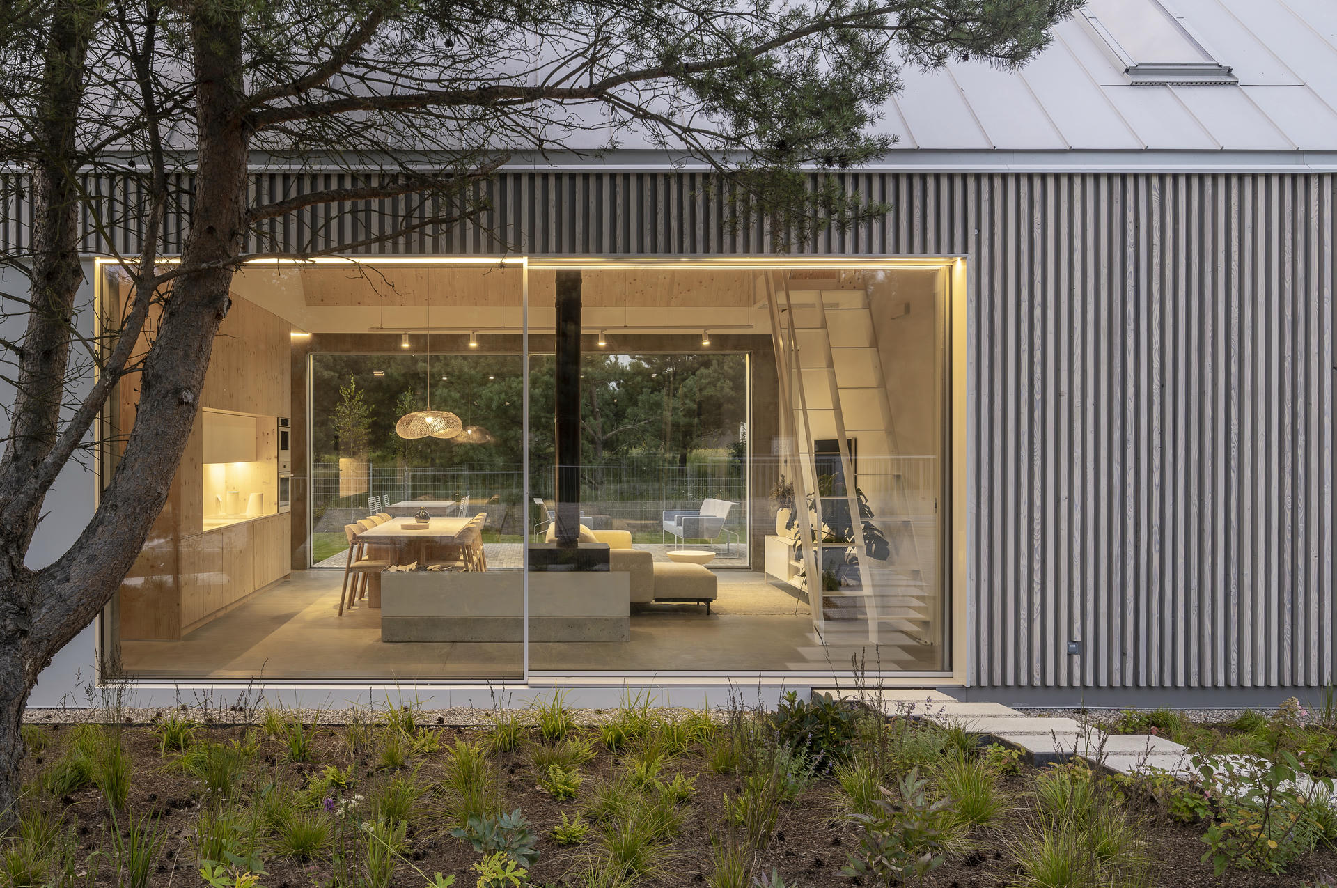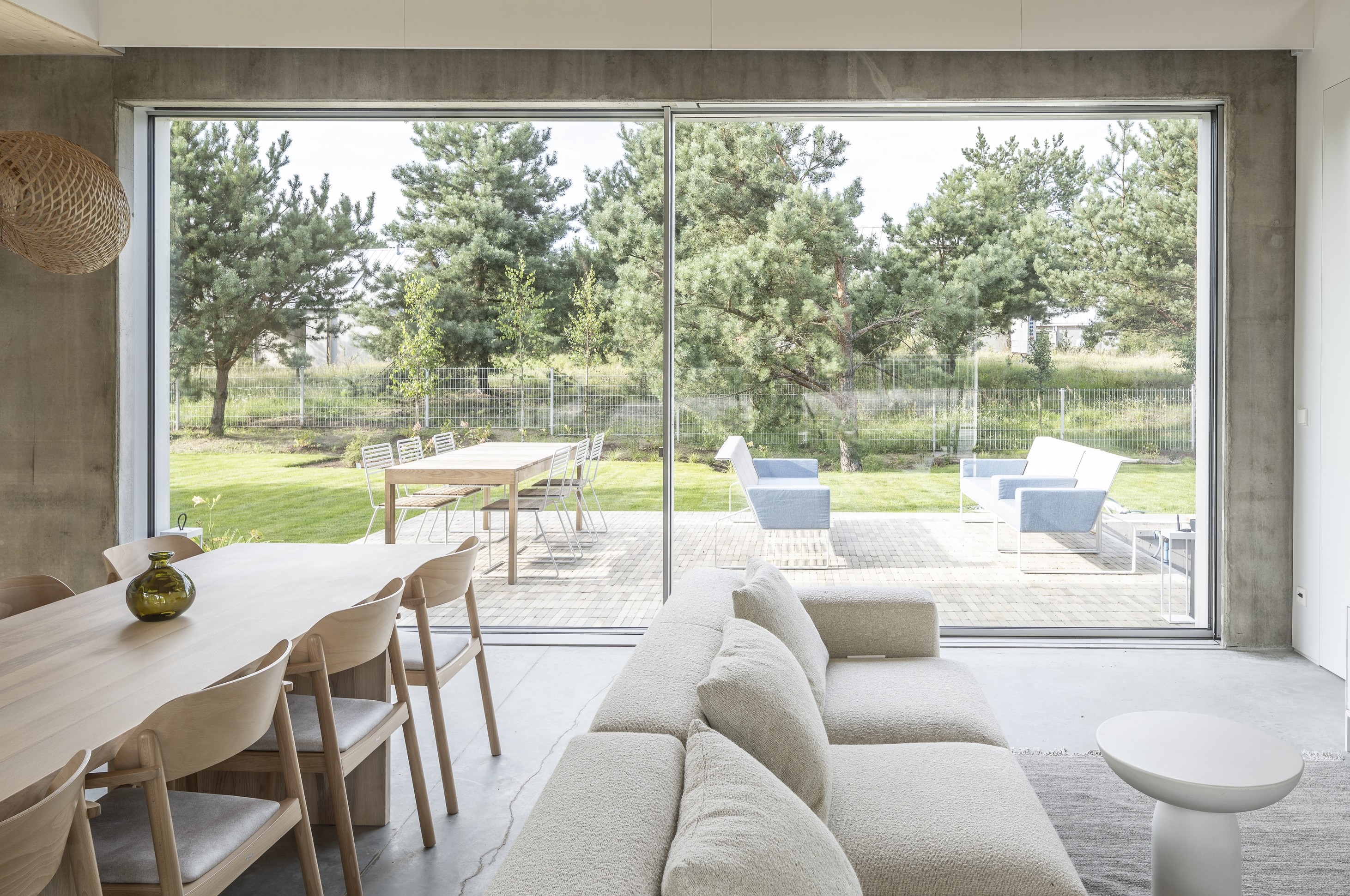 Dominującymi materiałami we wnętrzu jest drewno jesionowe i świerkowe (użyte m.in. na podbitce dachu, schodach, podłodze na antresoli oraz we frontach kuchennych) oraz beton architektoniczny, z którego wykonana jest m.in. podłoga na parterze. Uwagę zwracają wielkoformatowe przeszklenia o cienkich ramach, w tym wyjątkowo lekkie i eleganckie przesuwne okna otwierające dom na dwie strony: taras z ogrodem oraz część frontową. Wyjście do ogrodu możliwe jest także z każdej sypialni na parterze.