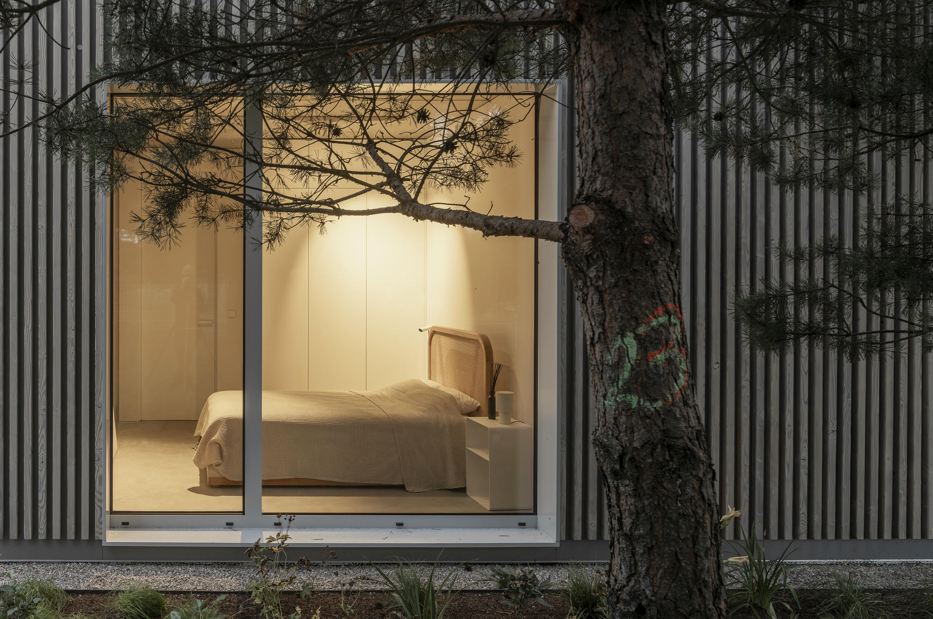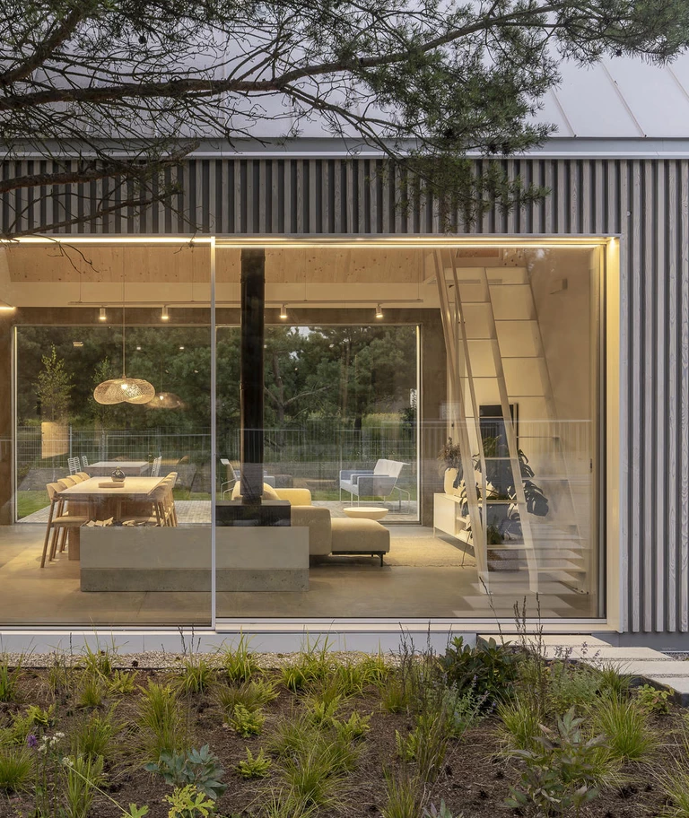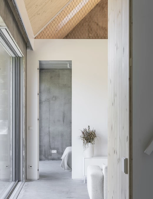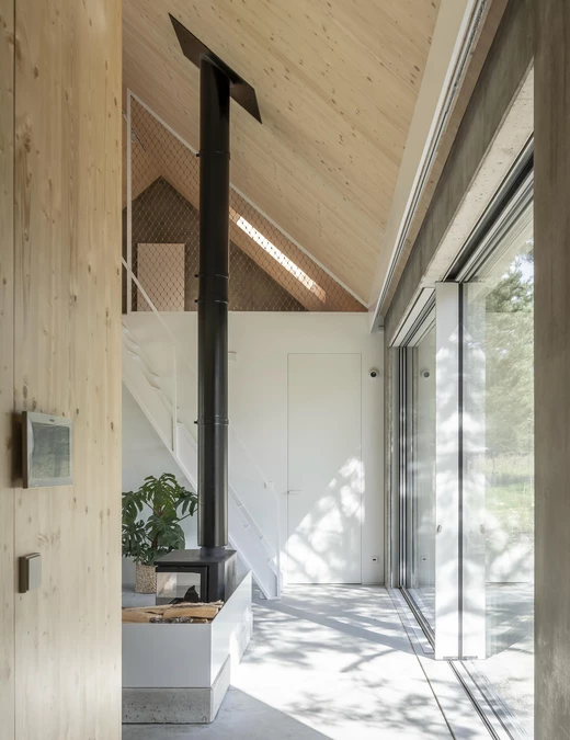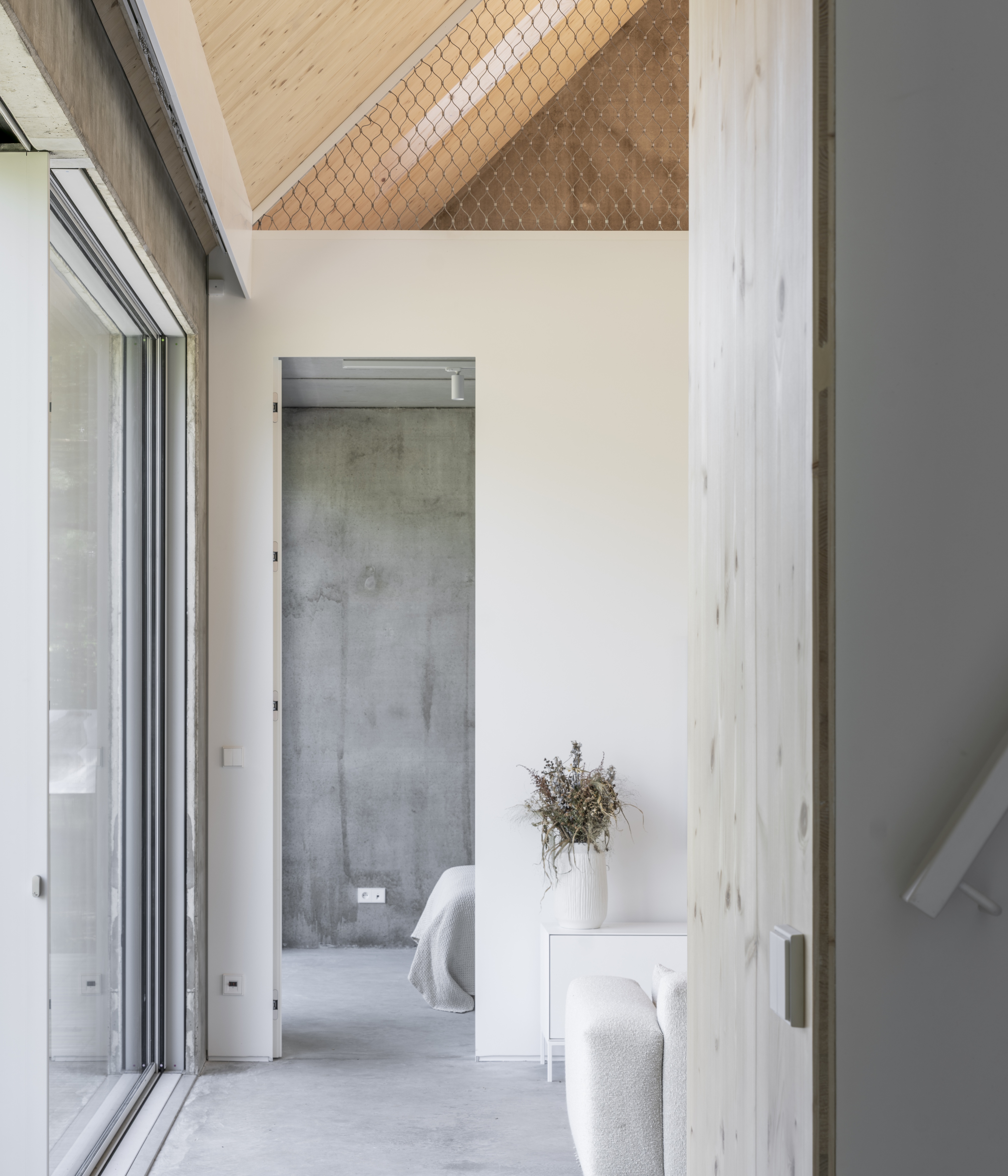 Dominującymi materiałami we wnętrzu jest drewno jesionowe i świerkowe (użyte m.in. na podbitce dachu, schodach, podłodze na antresoli oraz we frontach kuchennych) oraz beton architektoniczny, z którego wykonana jest m.in. podłoga na parterze. Uwagę zwracają wielkoformatowe przeszklenia o cienkich ramach, w tym wyjątkowo lekkie i eleganckie przesuwne okna otwierające dom na dwie strony: taras z ogrodem oraz część frontową. Wyjście do ogrodu możliwe jest także z każdej sypialni na parterze.