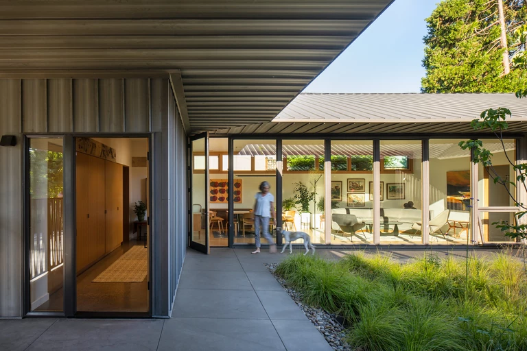 Duże przeszklenia otwierają dom na wewnętrzny dziedziniec, na którym architekci z pracowni Waechter Architecture Design Team wygospodarowali miejsce na małą, prywatną łąkę. Od strony ulicy dom wygląda, jak mała twierdza. Wrażenie niedostępności potęguje ciemna fasada zrobiona z metalowych paneli.