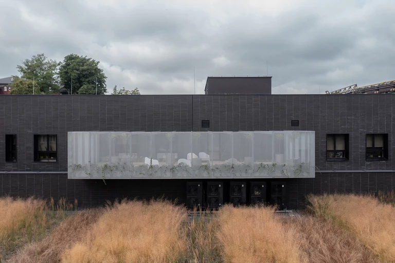 Jak przyznają twórcy projektu, podczas poszukiwania koloru dla elewacji, kluczowe okazało się dobranie zieleni, posadzonej wokół budynku. „Wysokie trawy o zróżnicowanej kolorystyce i typologii, spowodowały ,,zmiękczenie” terenów poprzemysłowych, nadając im lekkości i tworząc przyjemne do użytkowania przestrzenie wokół budynku” - wyjaśniają. Elewację wykończono czarną cegłą, która stała się tłem dla rosnącej tuż obok bujnej roślinności.