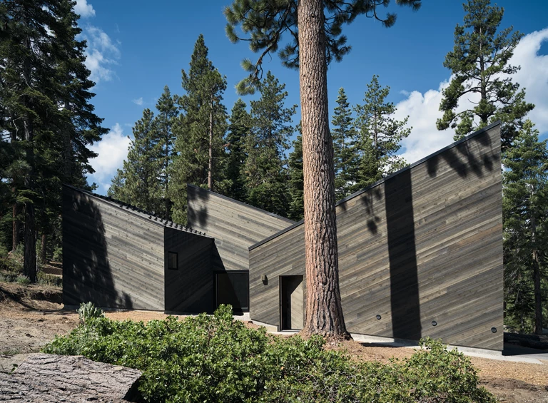 Dom powstał jako reinterpretacja tradycyjnej górskiej chaty, ale jego forma wynika przede wszystkim z topografii miejsca. Dom stoi na południowym skraju jeziora Tahoe, na wysokości ponad 1800 metrów. Architekci rozłożyli projekt na cztery bryły o spadzistych dachach, ustawione kaskadowo wzdłuż naturalnego nachylenia działki. Dzięki temu ograniczyli zakres prac ziemnych i zachowali najważniejsze elementy zastanego otoczenia – duże głazy, wysokie sosny i nasłoneczniony fragment płaskiego terenu.
