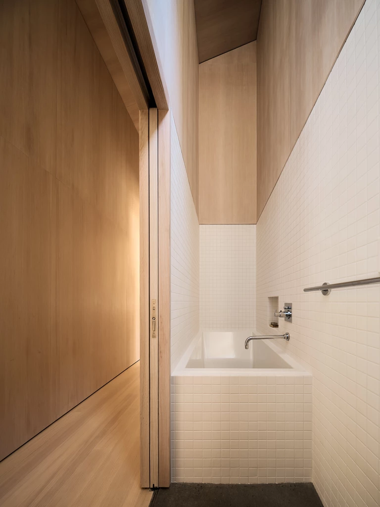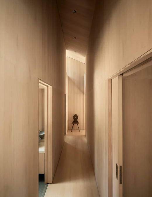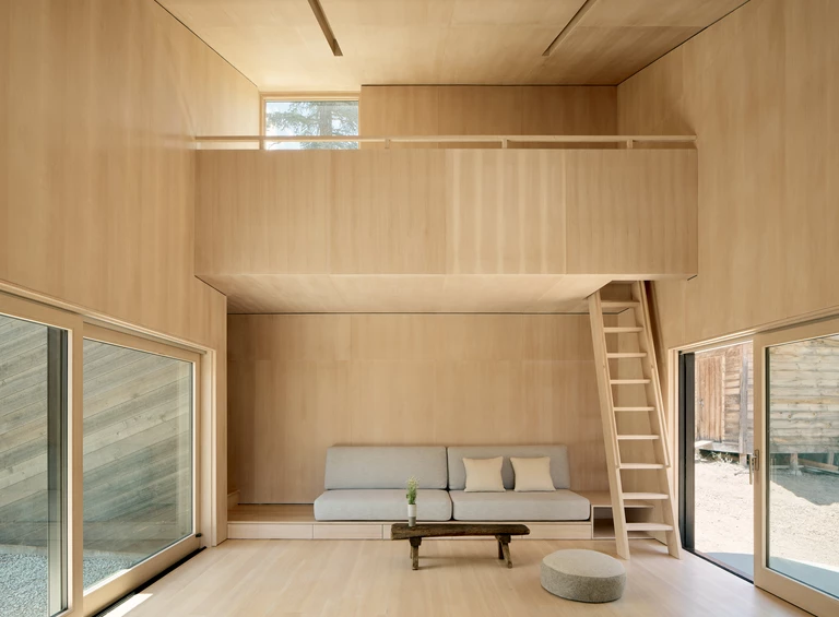Projektanci konsekwentnie podporządkowali wnętrze prostocie codziennego użytkowania. Spadziste dachy umożliwiły wprowadzenie antresoli, które pełnią funkcję domowego biura i miejsc do zabawy. Zabudowy z drewna, otwarte półki ze sklejki, zintegrowane oświetlenie i meble projektowane na zamówienie tworzą spójne i uporządkowane tło dla życia rodzinnego. W salonie pojawiła się też sofa ze schowkiem, do antresoli prowadzi sklejkowa drabina, a w pokoju dzieci architekci zaprojektowali dodatkową platformę z ścianką wspinaczkową i kryjówką przypominającą domek na drzewie.