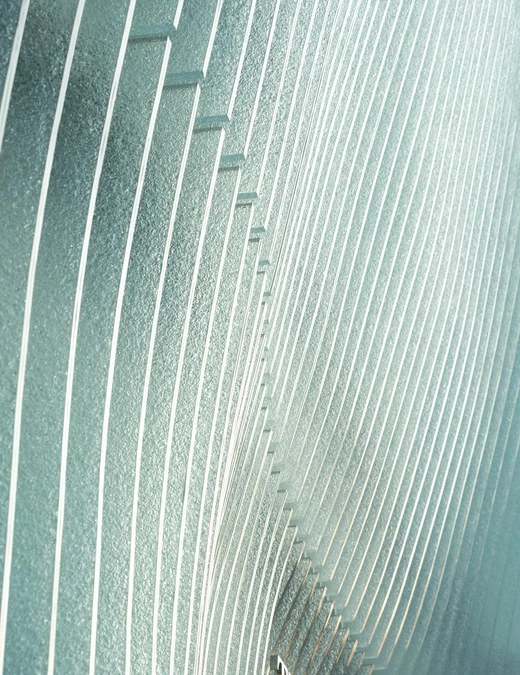 Szklane elementy wykonano z materiałów pochodzących z recyklingu i wyprodukowanych lokalnie. Wznoszą się one na pełną wysokość czterokondygnacyjnego budynku, a ich gęste ułożenie tworzy warstwową strukturę, wzmacnia efekt przenikania światła i buduje rzeźbiarski charakter elewacji.