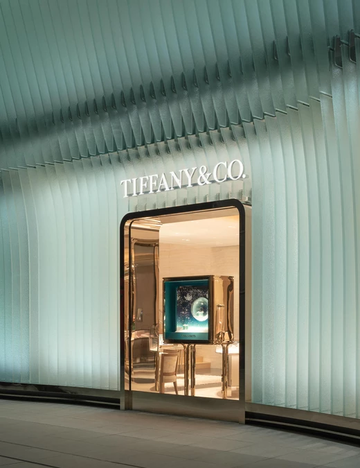 Fasada budynku została ukształtowana z pionowych, półprzezroczystych szklanych płyt o miękko zaokrąglonych krawędziach. Te delikatnie falujące elementy nadają bryle eteryczny, niemal jubilerski charakter i sprawiają, że budynek zmienia swój wygląd w zależności od punktu widzenia oraz pory dnia. Inspiracją dla płynnej formy była kultowa bransoletka Bone Cuff autorstwa Elsy Peretti – jeden z najbardziej rozpoznawalnych projektów w historii marki.