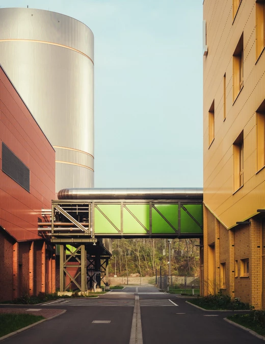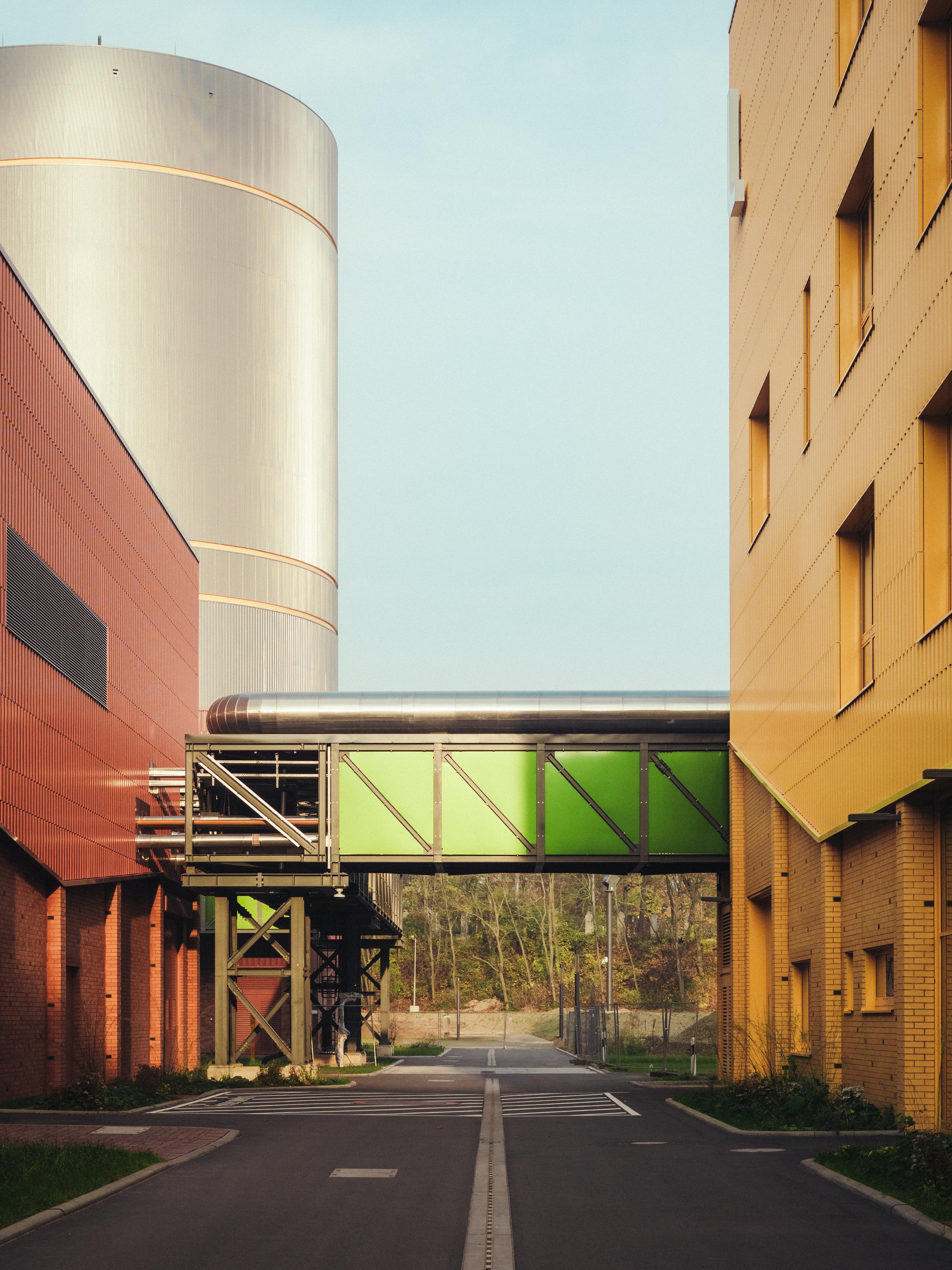 W Niemczech, glazurowane panele z drobną pionową strukturą pokrywają budynki elektrociepłowni w Lipsku.
