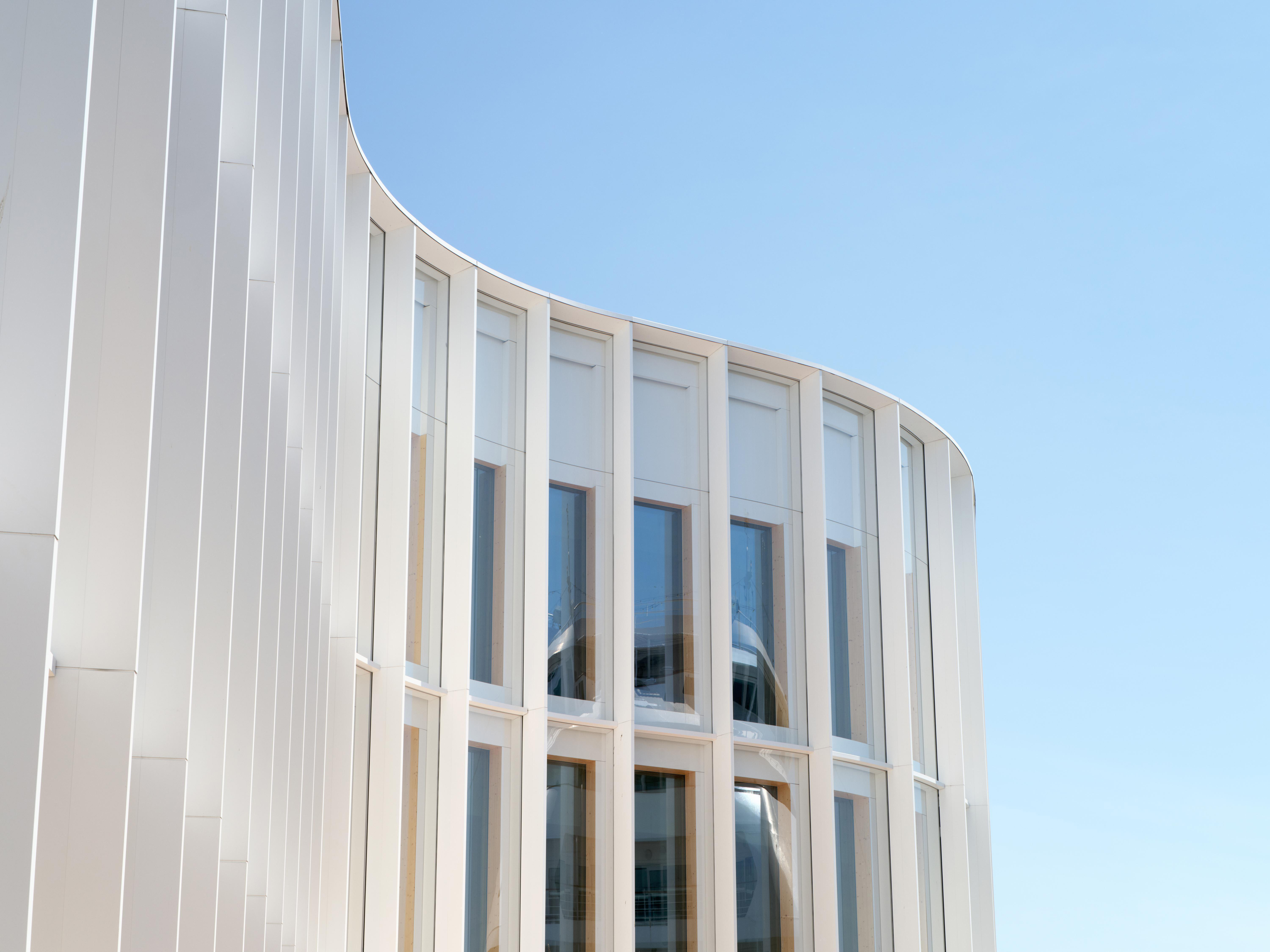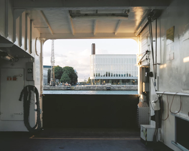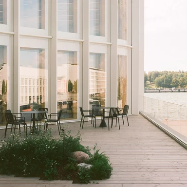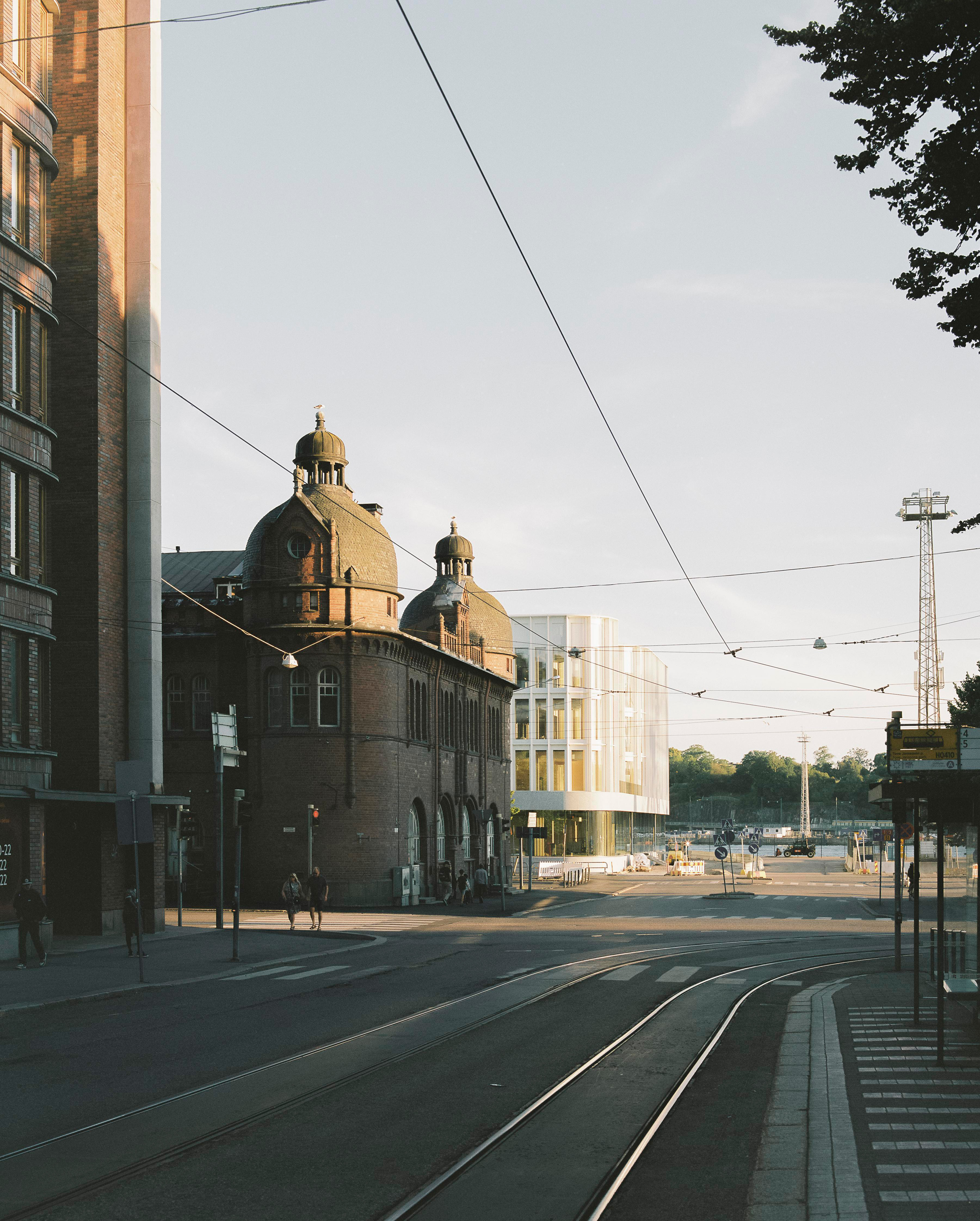 Budynek kontynuuje neoklasyczną linię zabudowy południowego nabrzeża stolicy Finlandii, a jego meandrująca elewacja ma na celu optyczne rozbicie skali bryły i nawiązanie do zróżnicowanej architektury okolicy. Istotnym rozwiązaniem technicznym jest podwójna struktura fasady. Zewnętrzna warstwa, złożona ze szkła, aluminium i granitu, pełni funkcję ochronną dla drewnianej konstrukcji, zabezpieczając ją przed bezpośrednim wpływem morskich warunków atmosferycznych. Dzięki temu zabiegowi wygląd budynku zmienia się w zależności od pory dnia i nasłonecznienia.