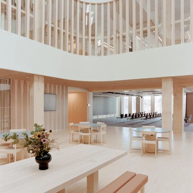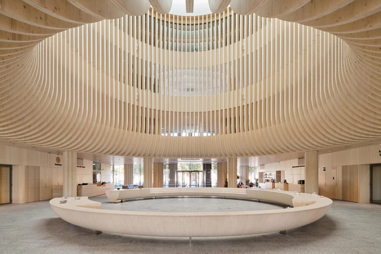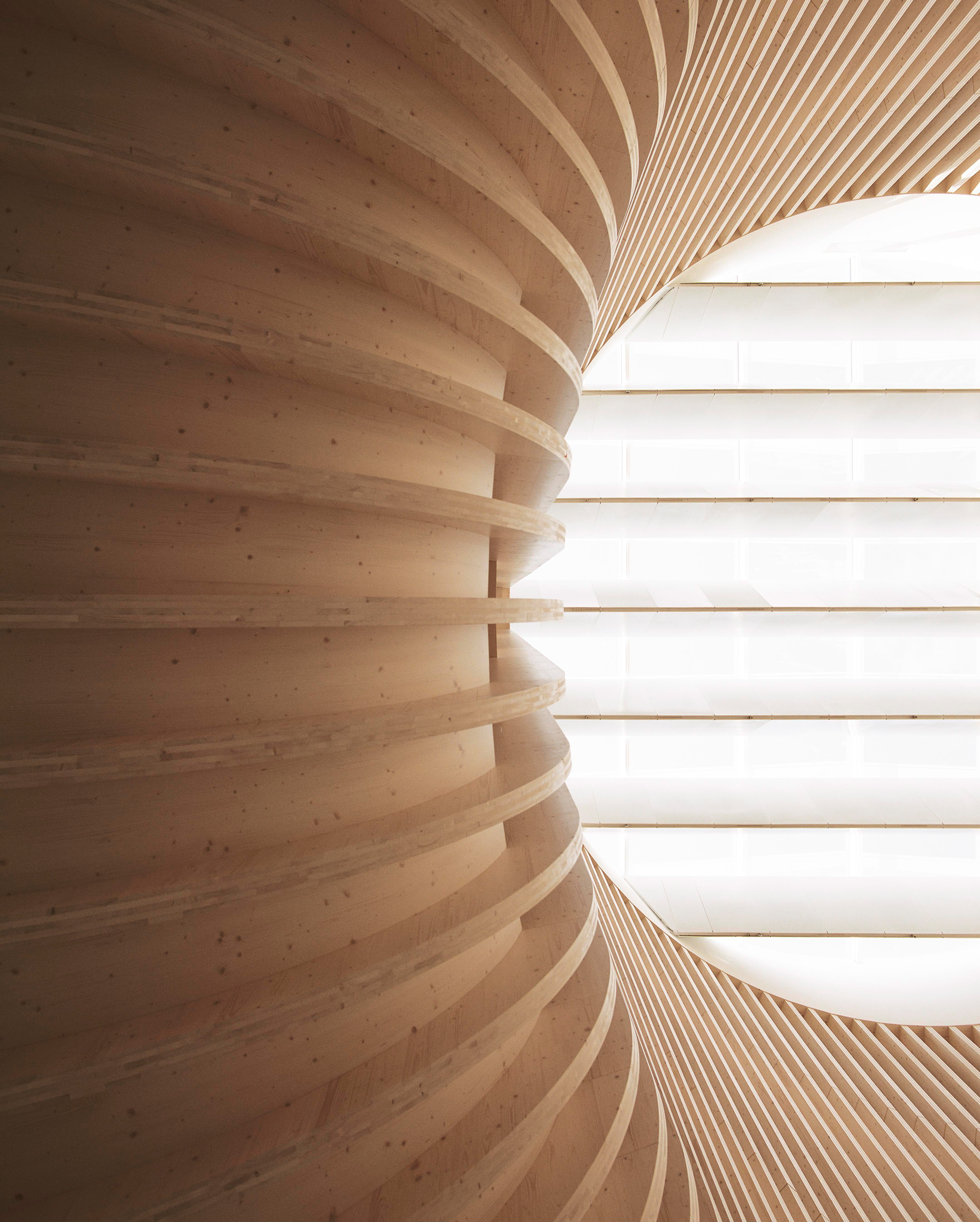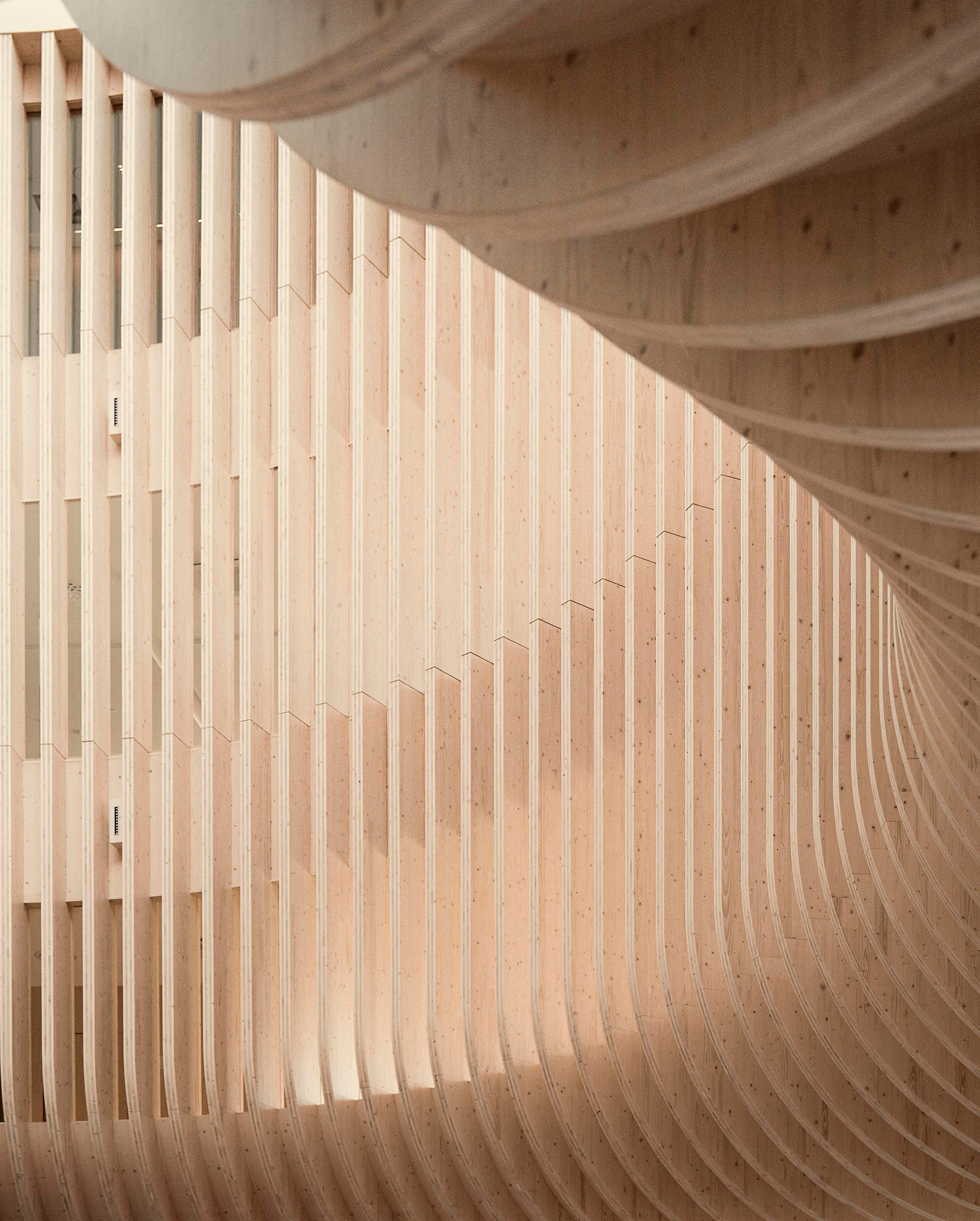 Wnętrza budynku zostały zaprojektowane z myślą o elastyczności i długim cyklu użytkowania. Konstrukcja opiera się na prefabrykowanych elementach z litego drewna świerkowego, przy czym szkielet słupowo-belkowy wykonano z laminowanego forniru (LVL), a ściany wewnętrzne i stropy z drewna klejonego krzyżowo (CLT). Łącznie do budowy ramy zużyto 7600 m³ drewna. Architekci zdecydowali się na wyeksponowanie świerkowych struktur, które uzupełniono detalami z drewna jesionowego. Całość dopełnia jasnoszary granit wykorzystany na elewacji, posadzkach oraz wewnątrz obiektu, co ma wizualnie wiązać budynek z jego miejskim kontekstem.