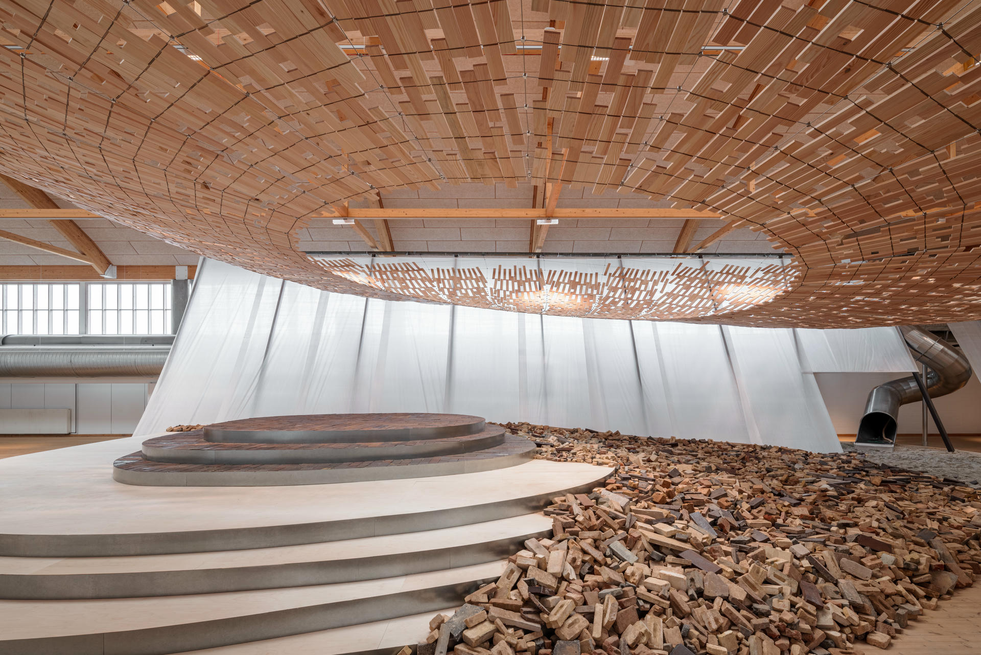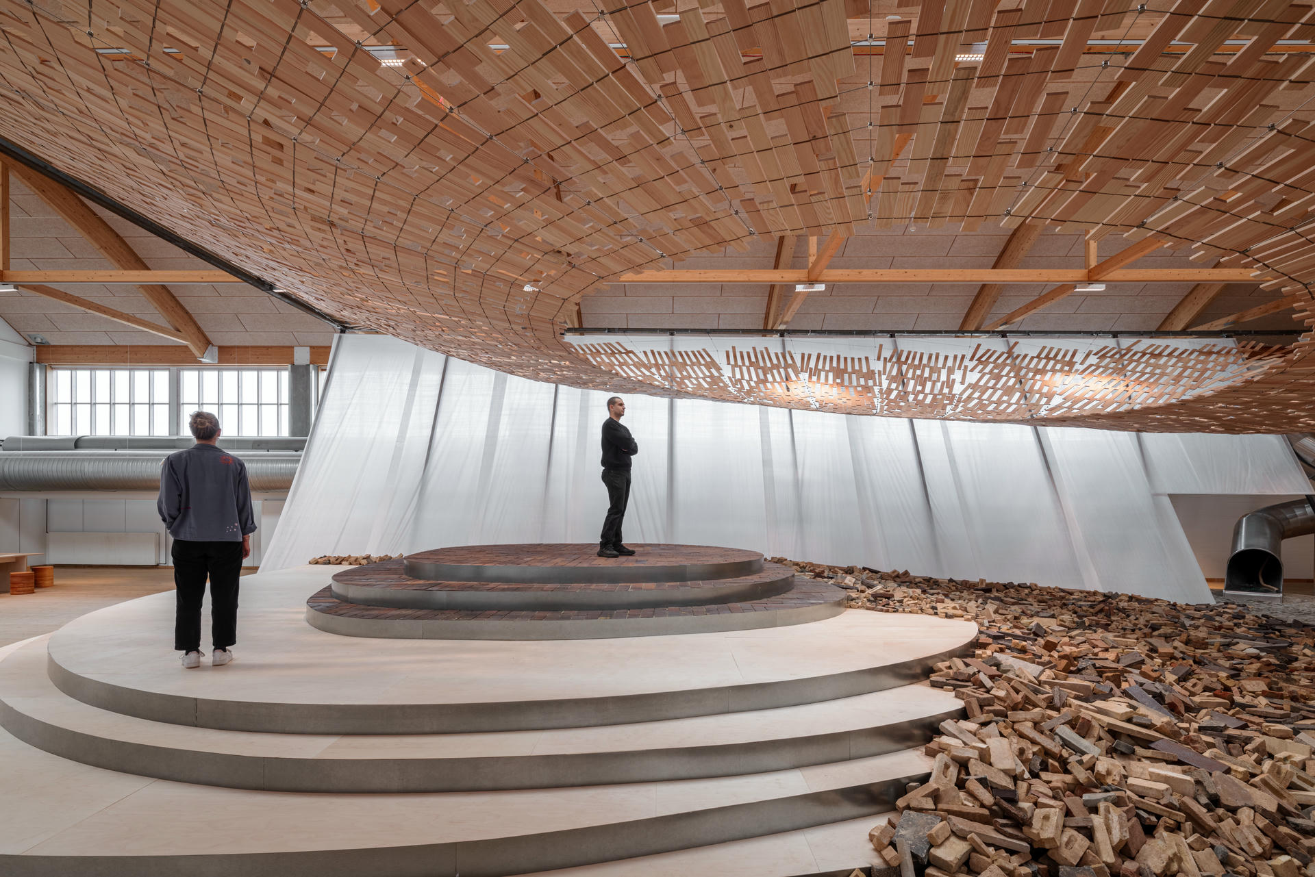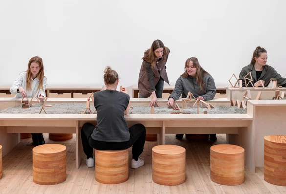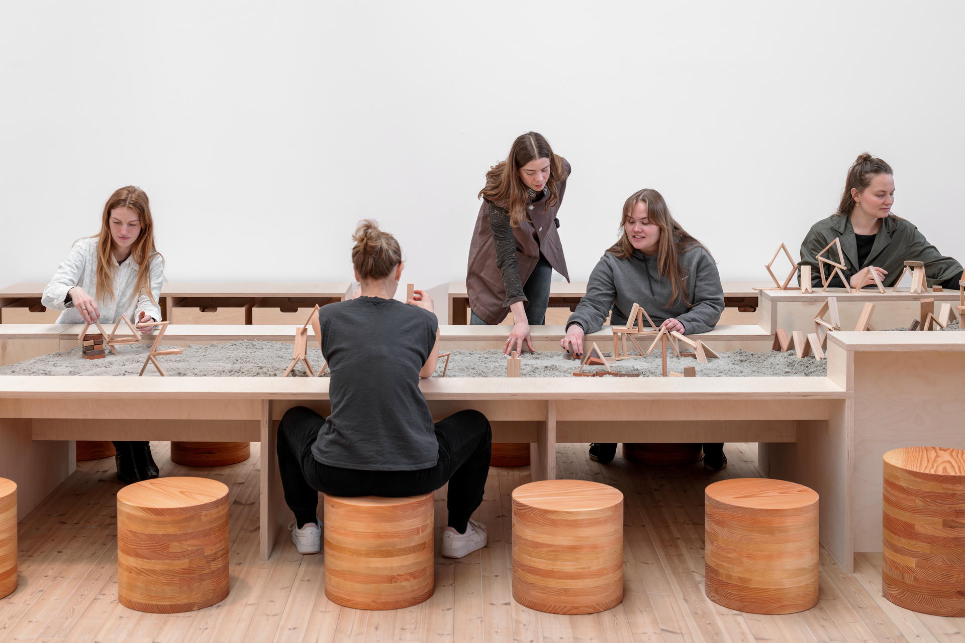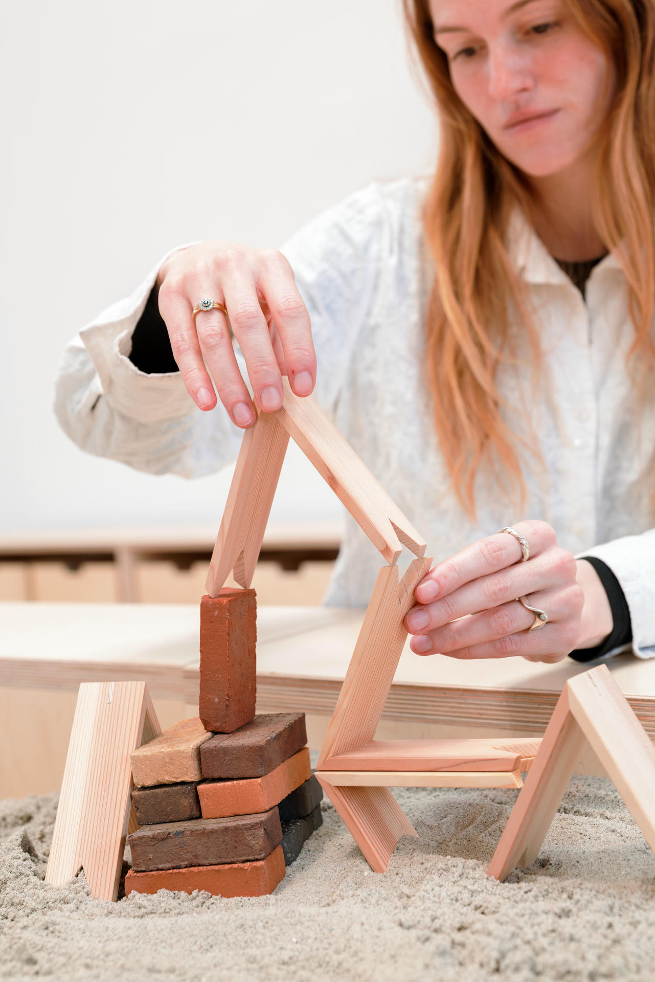 Ważnym elementem wystawy jest strefa warsztatowa. To przestrzeń, w której odwiedzający mogą wejść w proces projektowy; budować, eksperymentować i testować różne rozwiązania. Do dyspozycji są m.in. klocki Tsumiki zaprojektowane przez Kumę, drewniane moduły oraz miniaturowe cegły.