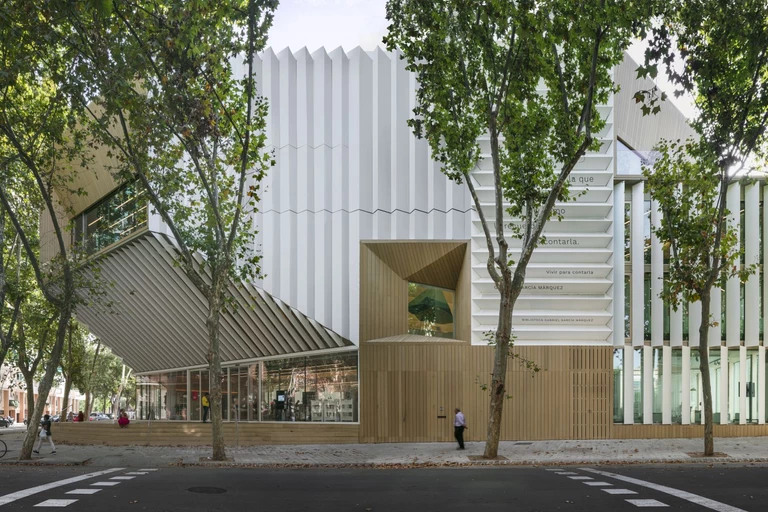 Biblioteka Garcíi Márqueza w Barcelonie – obiekt wyróżniony nagrodą specjalną dla młodych talentów (Emerging Architecture Winner), zaprojektowany przez hiszpańskie biuro SUMA Arquitectura – to budynek usytuowany w zróżnicowanej społecznie i przez wiele lat zaniedbanej dzielnicy miasta. Pracy nad projektem architektonicznym towarzyszył projekt badawczy, mający na celu przedefiniowanie współczesnego modelu biblioteki. Drewniana bryła 6-piętrowego gmachu przypomina stos książek i znajduje się na podwyższonym, dostępnym dla wszystkich i otoczonym drzewami placu, będącym przedłużeniem pieszej osi dzielnicy.