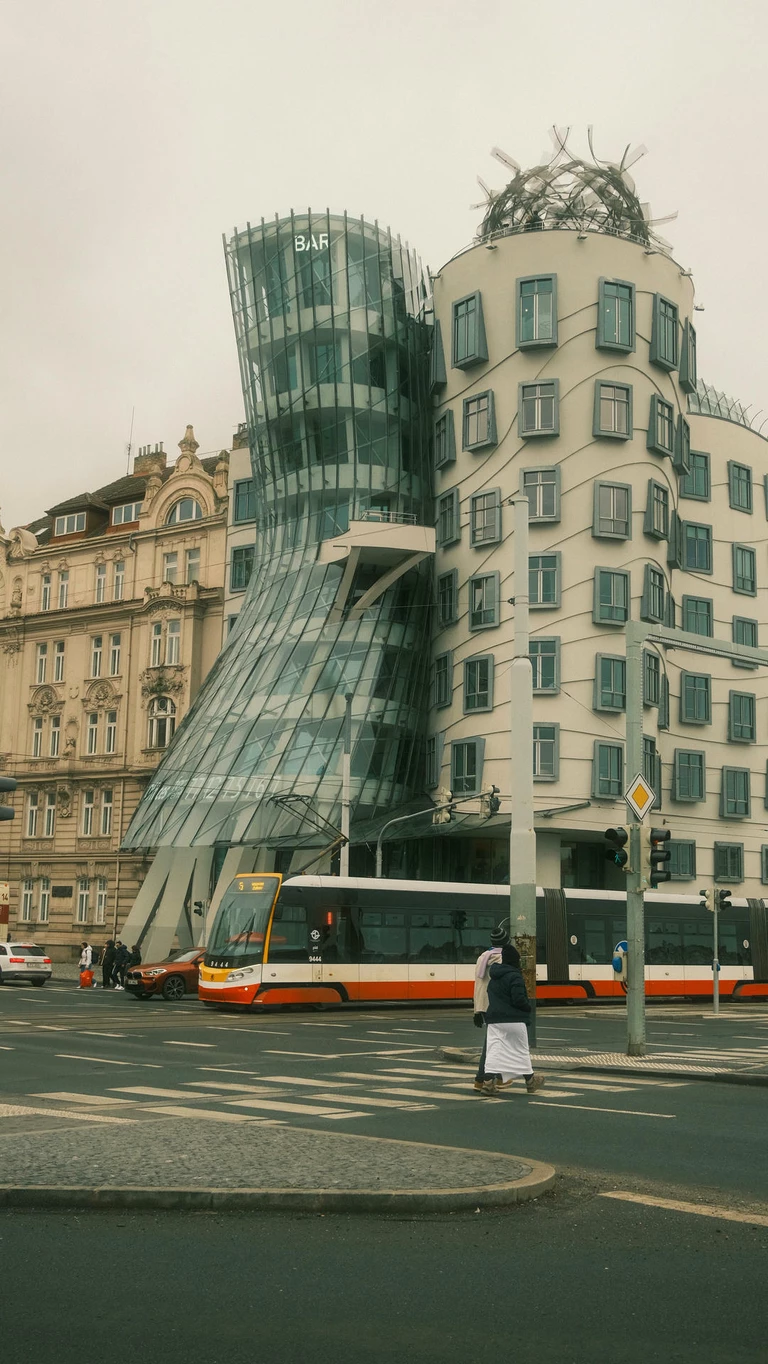 Tańczący Dom został zaprojektowany przez Franka Gehry’ego we współpracy z Vlado Milunićem. Budynek, ukończony w 1996 roku, zyskał swoją nazwę dzięki charakterystycznym bryłom przypominającym parę tancerzy – i to nie przypadkowych, lecz słynny duet Ginger Rogers i Freda Astaire’a.