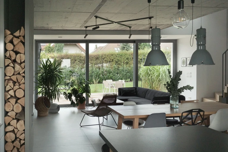 Całość została wzbogacona drewnem na fragmentach elewacji budynku oraz na tarasie ogrodowym. Zielone dopełnienia z bujnej roślinności doniczkowej oraz wysokich traw i krzewów w ogrodzie stworzyły razem z domem harmonijną całość.