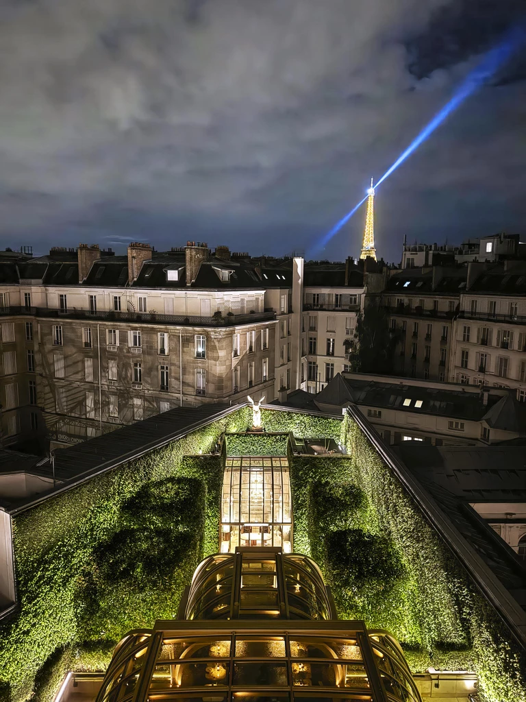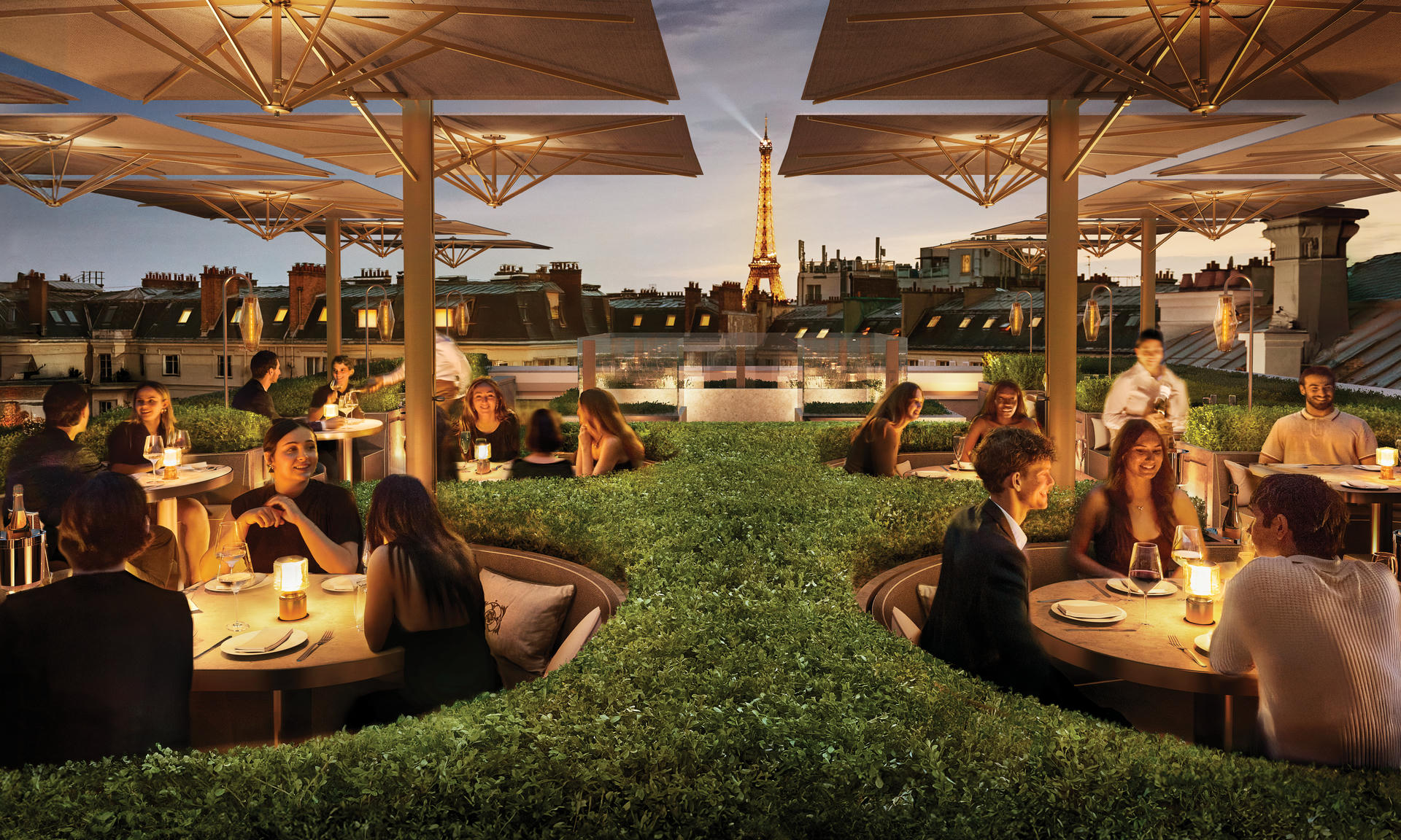 Restauracja w ogrodzie zimowym znajduje się na niższym poziomie dachu i przykryta jest przeszklonym zadaszeniem, dzięki czemu wnętrze wypełnia naturalne światło. Natomiast bar na górnym poziomie dachu oferuje panoramiczne widoki na miasto, w tym na Wieżę Eiffla.