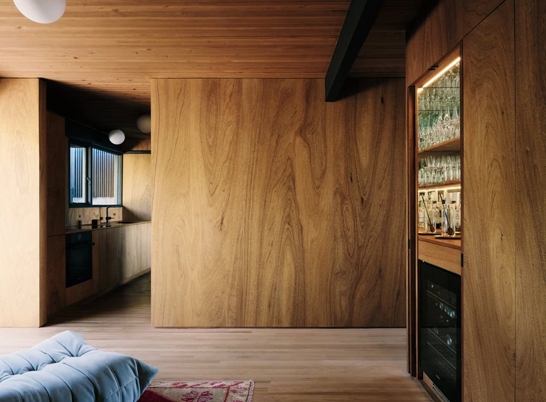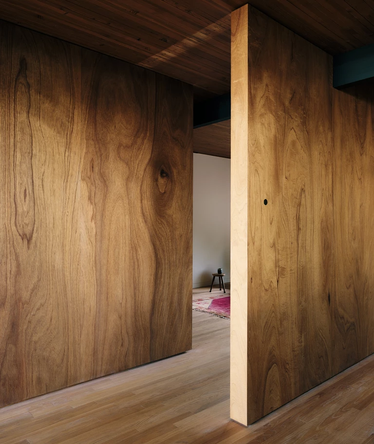 W centrum domu architekci zaprojektowali drewniany rdzeń obudowany starannie wykonanymi panelami i zabudową stolarską. W jego wnętrzu ukryli funkcjonalne elementy domu – schowki, instalacje i pomieszczenia techniczne, dzięki czemu główne przestrzenie mieszkalne zachowały klarowny i uporządkowany charakter. Ten drewniany wolumen kontrastuje z liniową kompozycją konstrukcji widocznymi belkami, cienkim stropem z desek łączonych gwoździami oraz szerokimi pasami okien.