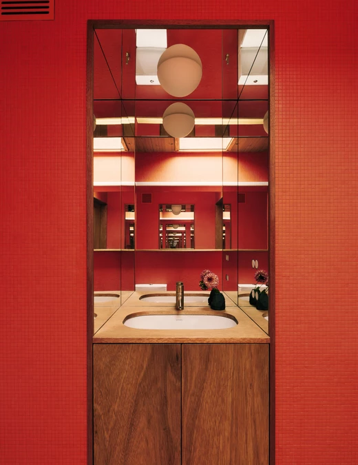 Dwie łazienki, ukryte w centralnym rdzeniu za drzwiami licowanymi z drewnianą okładziną, zaskakują intensywną czerwienią mozaikowych płytek i wprowadzają wyraźny akcent kolorystyczny do stonowanego wnętrza.