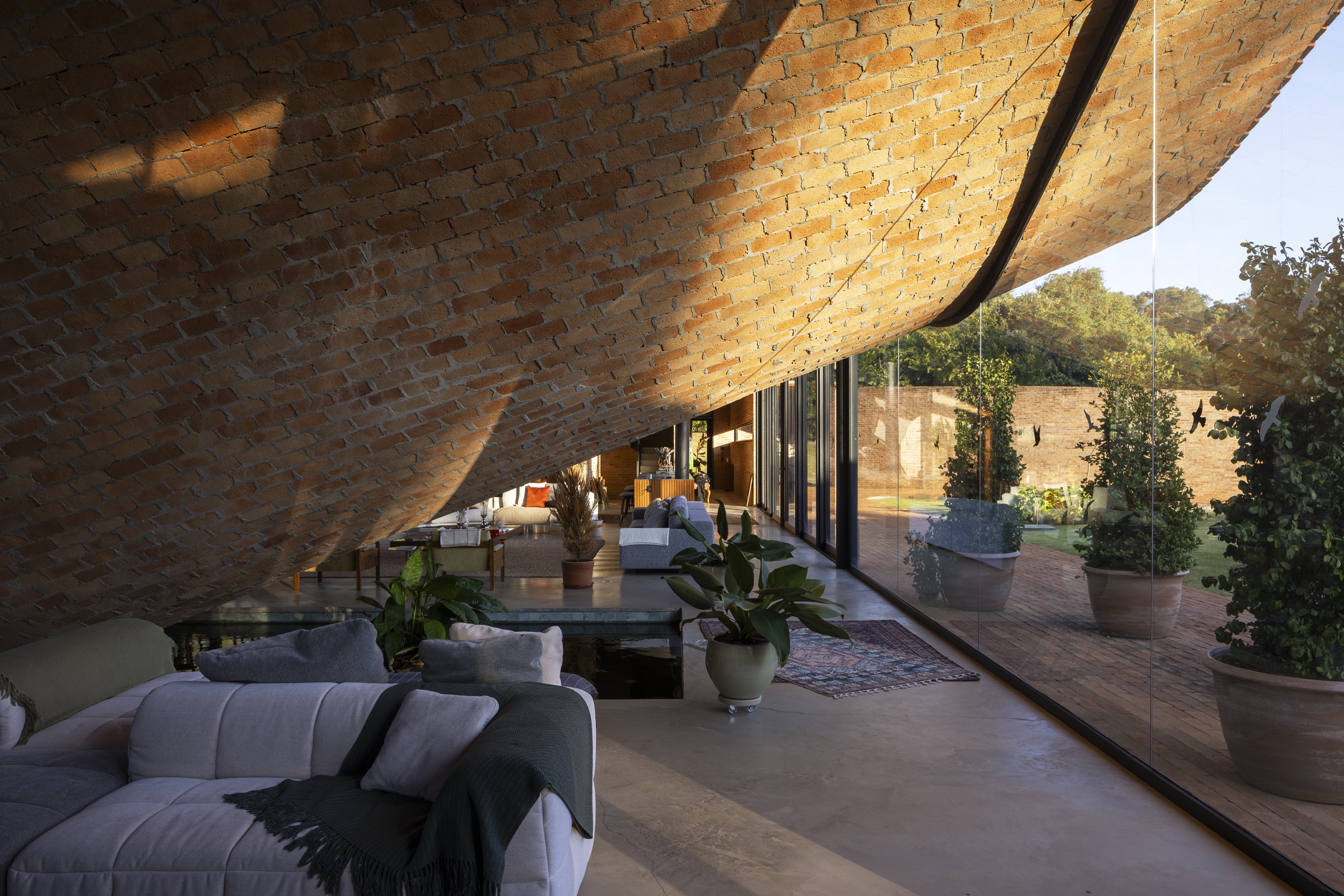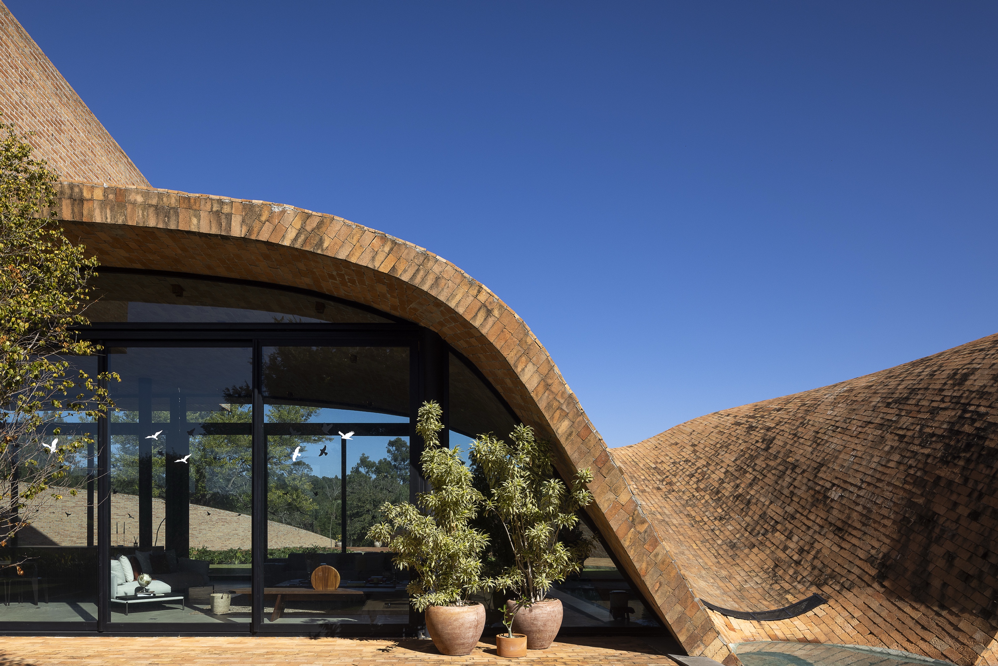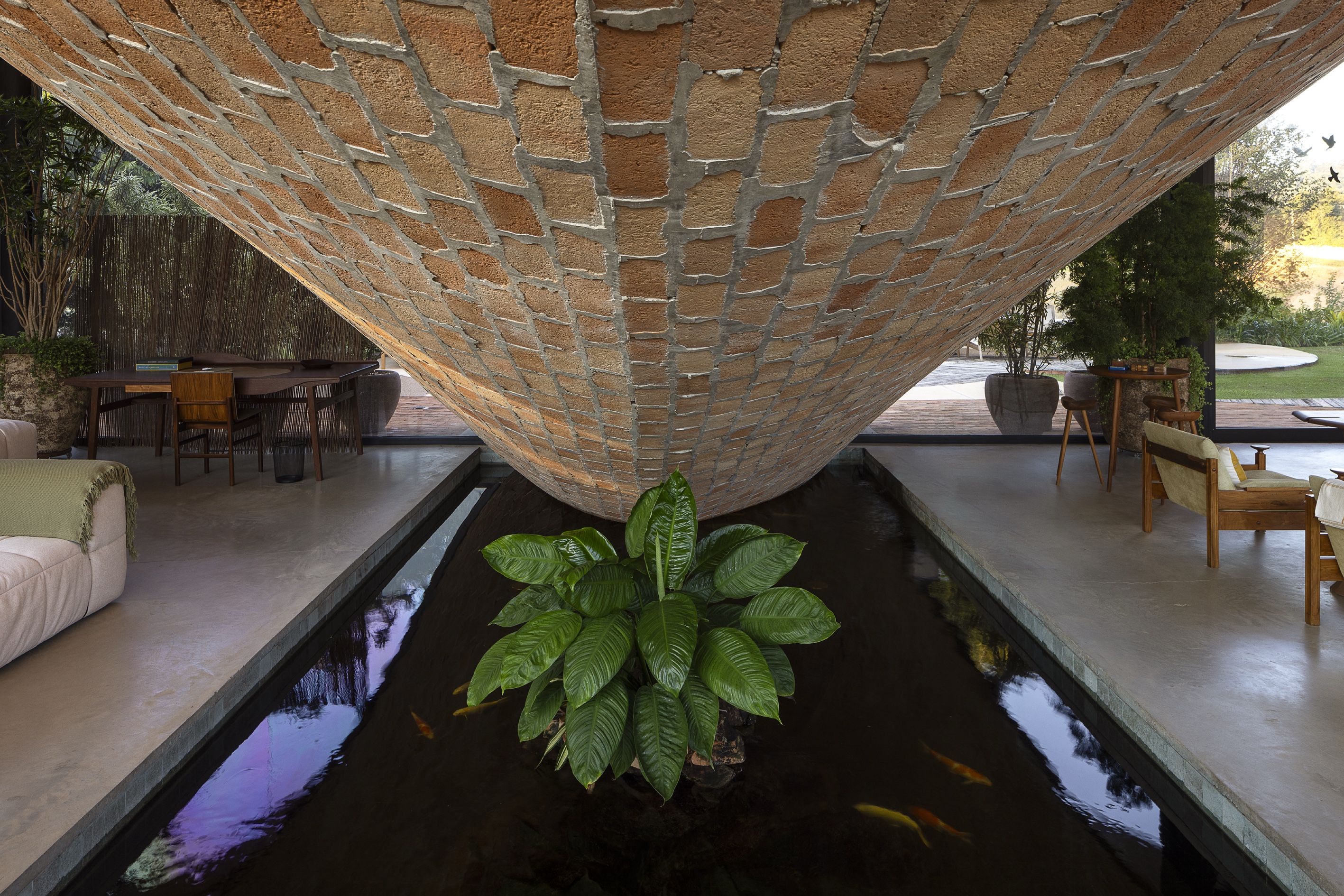 Najsilniejszym gestem formalnym jest odsłonięty, ceglany dach o wyraźnej, falującej krzywiźnie, który w jednym punkcie nurkuje w kierunku wody. Ta deformacja tworzy lejek do zbierania deszczówki, kierując ją do basenu i sąsiedniego „water hole”, rozdzielając przy tym optycznie oba zbiorniki. Konstrukcja podwójnych stropów, głębokie okapy i konsekwentnie zacienione otwarcia pracują jak pasywne urządzenia chłodzące: rozpraszają słońce, stabilizują temperaturę i pozwalają zrezygnować z klimatyzacji w tropikalnym klimacie interioru São Paulo.