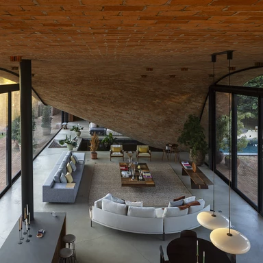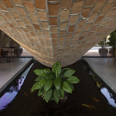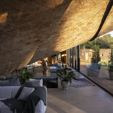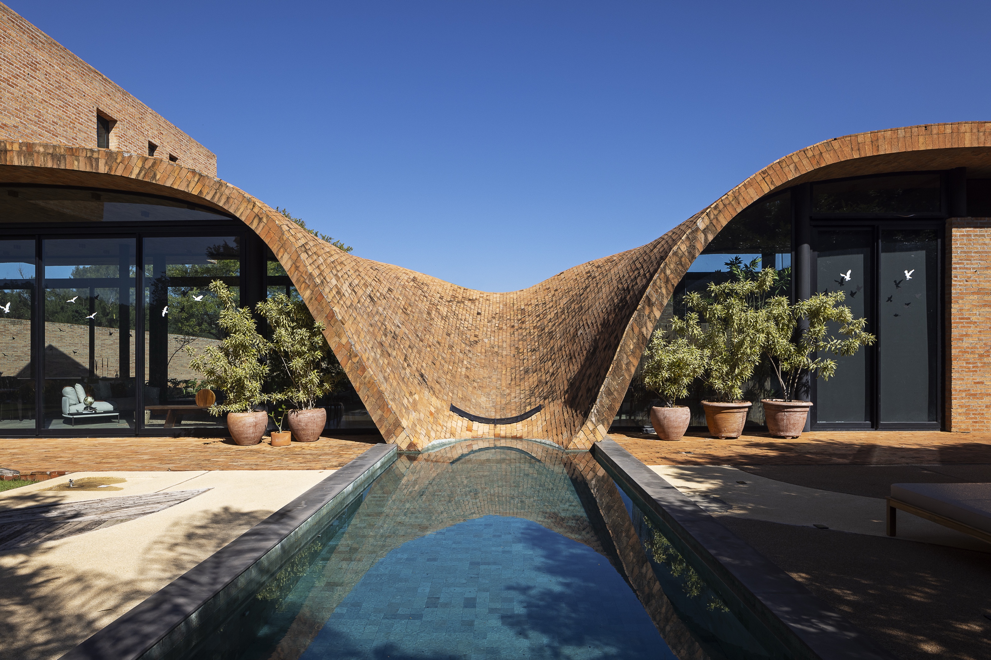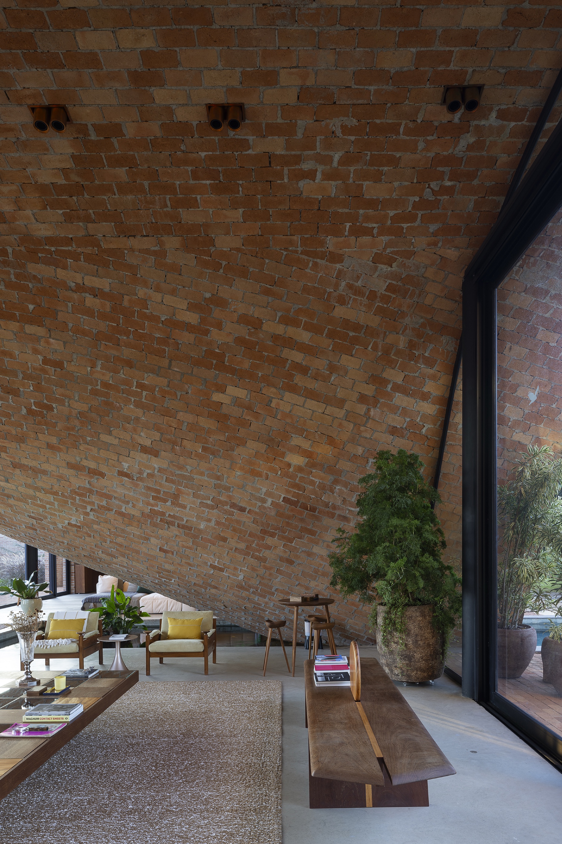 Najsilniejszym gestem formalnym jest odsłonięty, ceglany dach o wyraźnej, falującej krzywiźnie, który w jednym punkcie nurkuje w kierunku wody. Ta deformacja tworzy lejek do zbierania deszczówki, kierując ją do basenu i sąsiedniego „water hole”, rozdzielając przy tym optycznie oba zbiorniki. Konstrukcja podwójnych stropów, głębokie okapy i konsekwentnie zacienione otwarcia pracują jak pasywne urządzenia chłodzące: rozpraszają słońce, stabilizują temperaturę i pozwalają zrezygnować z klimatyzacji w tropikalnym klimacie interioru São Paulo.