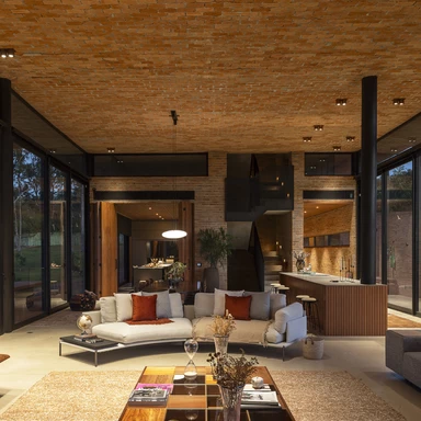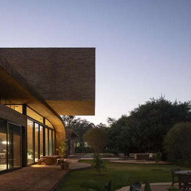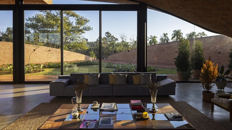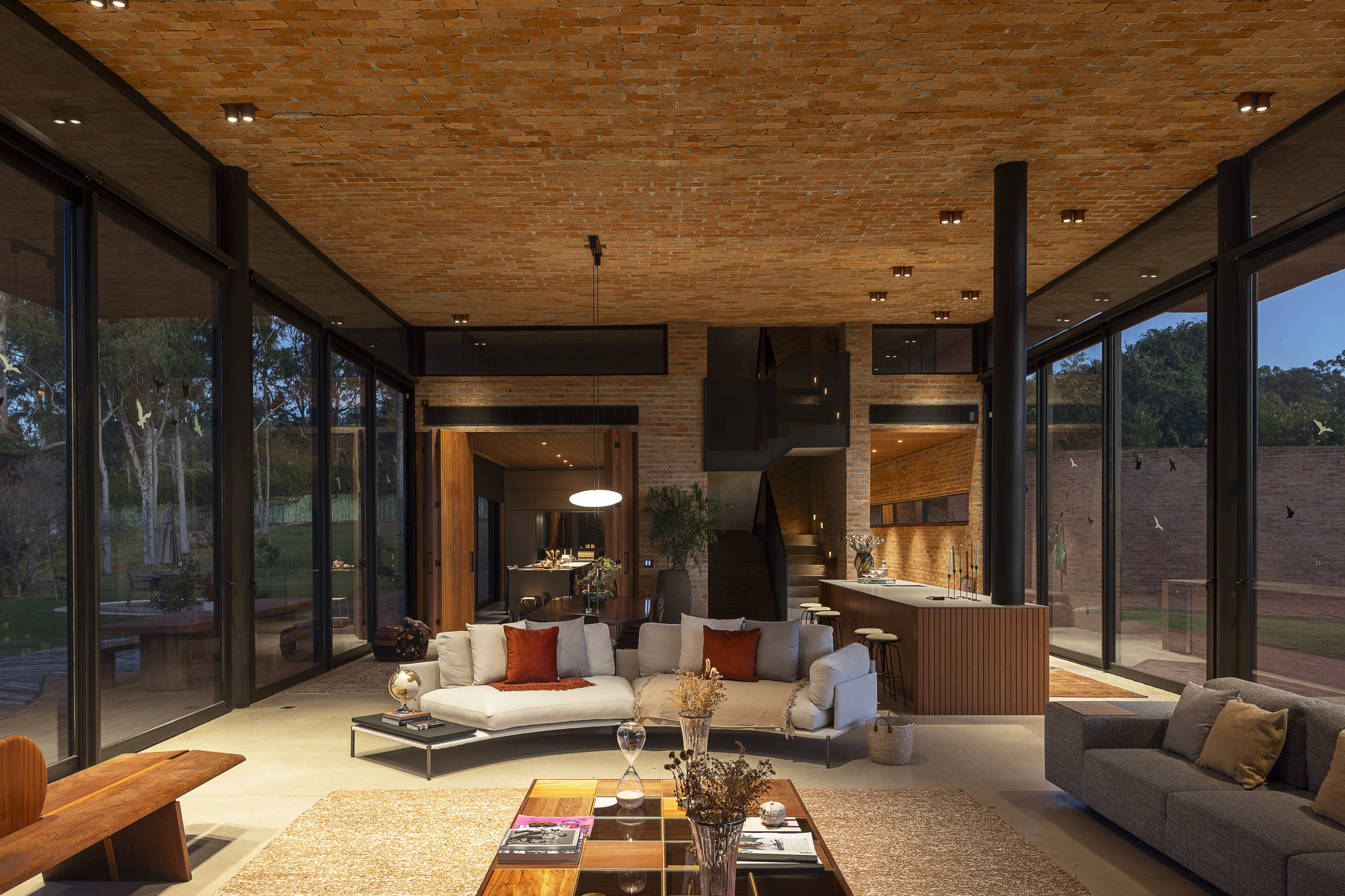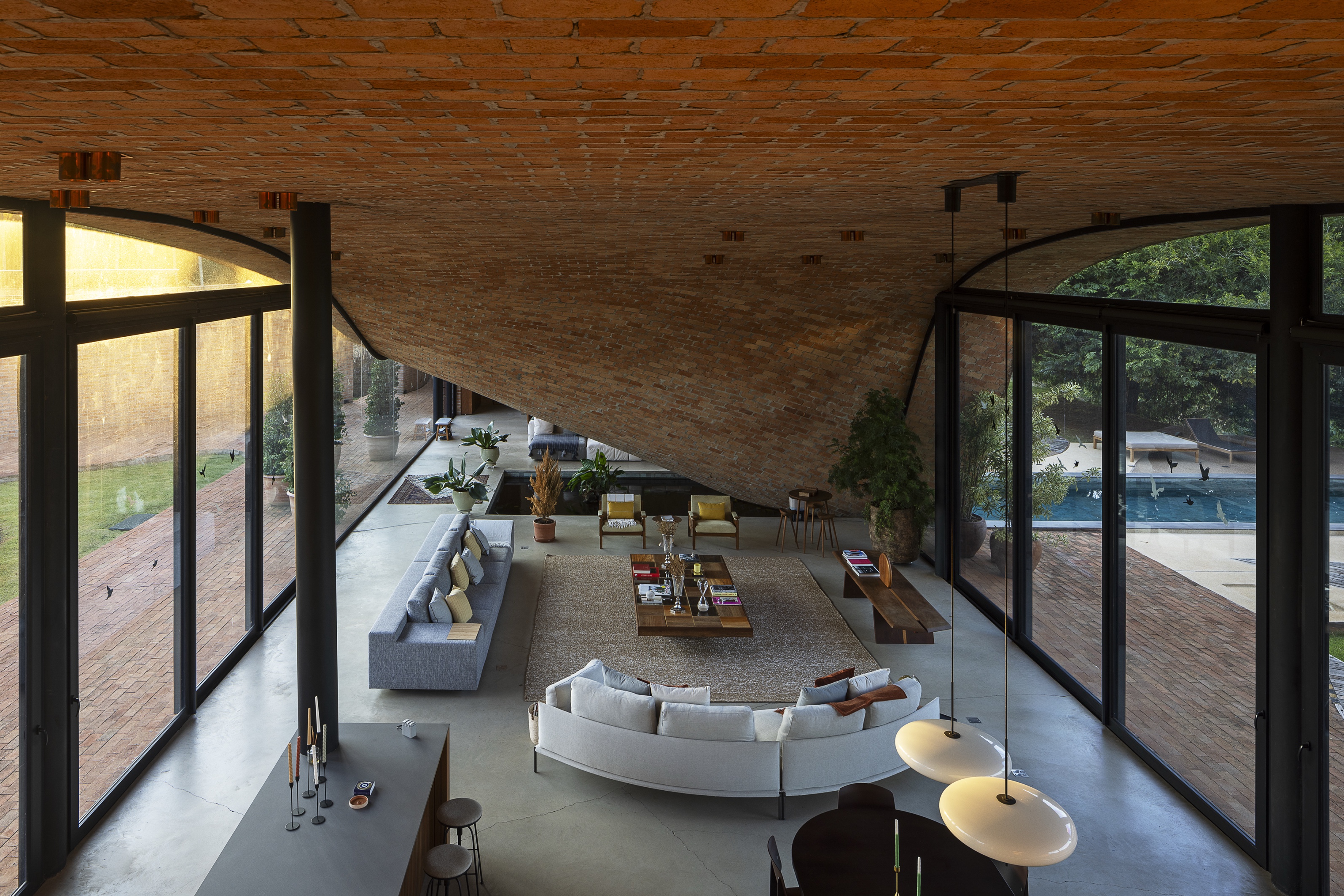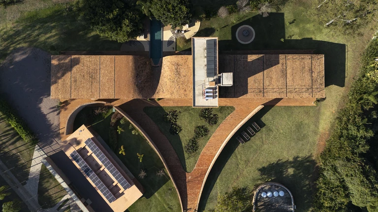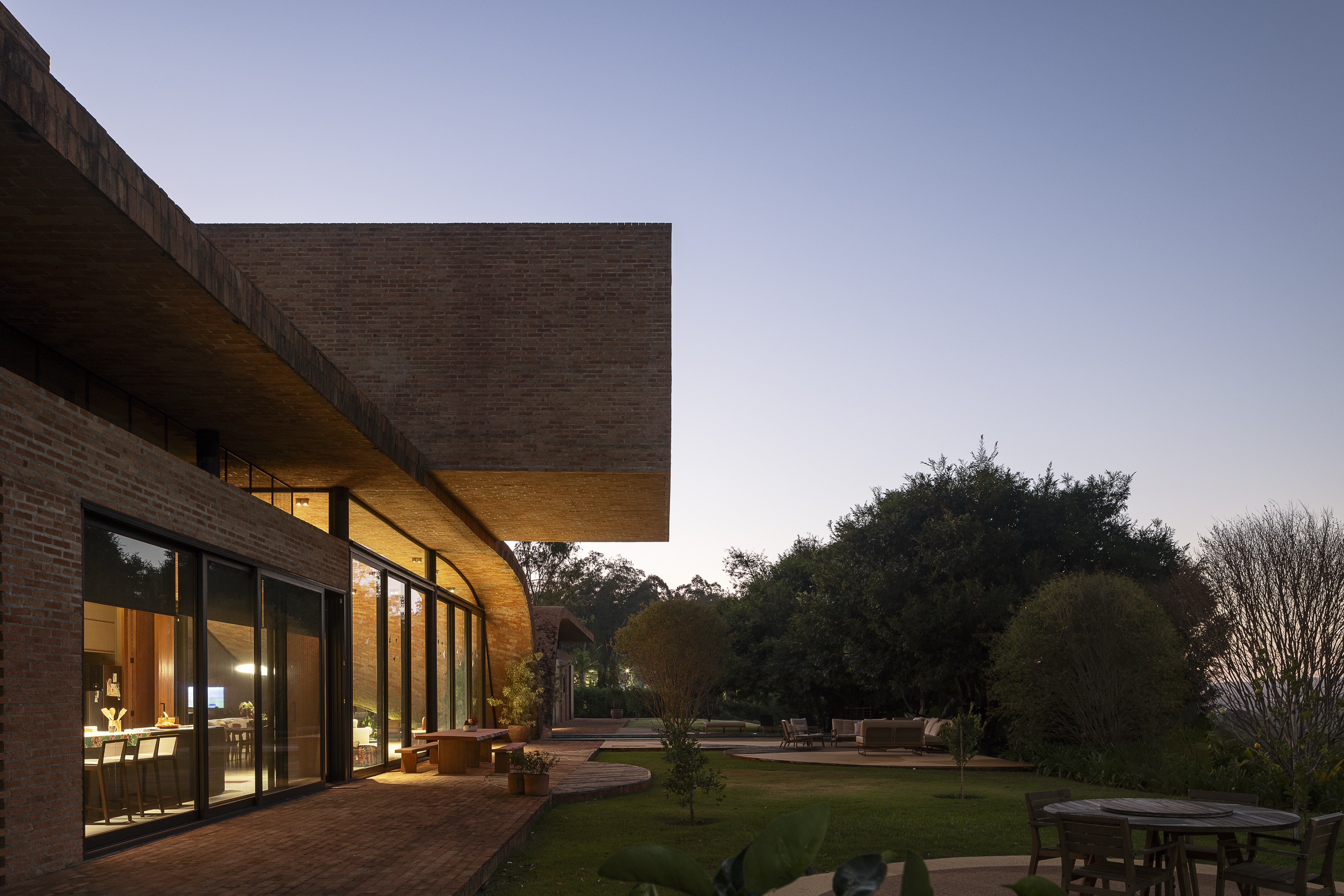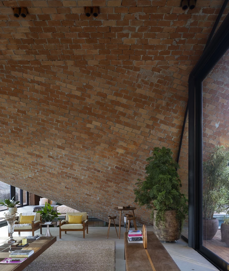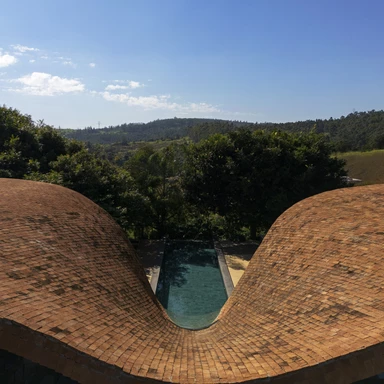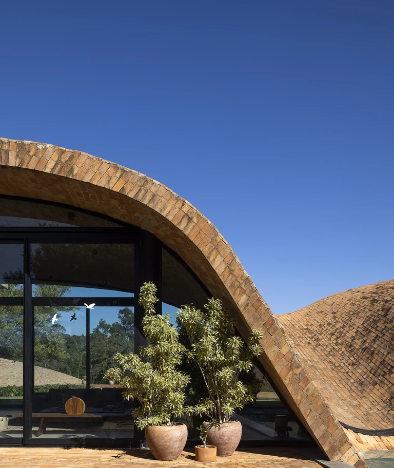 Dom pojawia się jak fala: ceglana linia dachu unosi się, opada i zanurza w tafli basenu, prowadząc deszczówkę prosto do wody. Passive House pod São Paulo to nie tyle „obiekt z widokiem na zieleń”, co wspólnie zaprojektowany ekosystem - architektura i reforestacja prowadzone równolegle z Vistara Paisagismo.