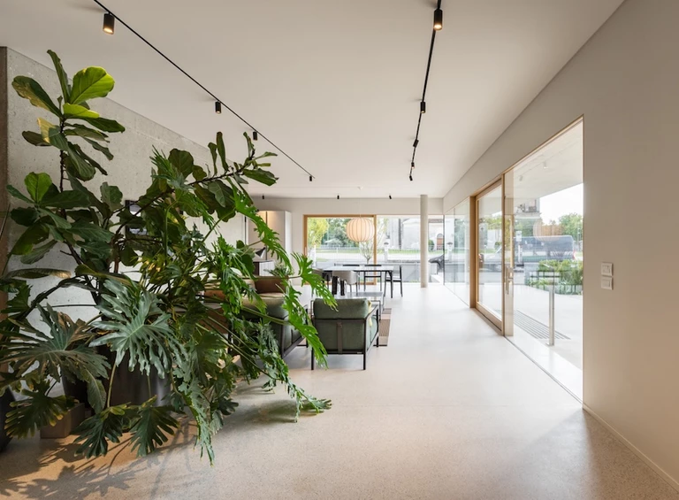 Wnętrze showroomu architekci rozplanowali wokół betonowej ściany spinającej przestrzeń ekspozycji, uzupełnionej o detale, które przywołują na myśl architekturę mieszkaniową: jak okap, narożne okno, czy też sam układ.