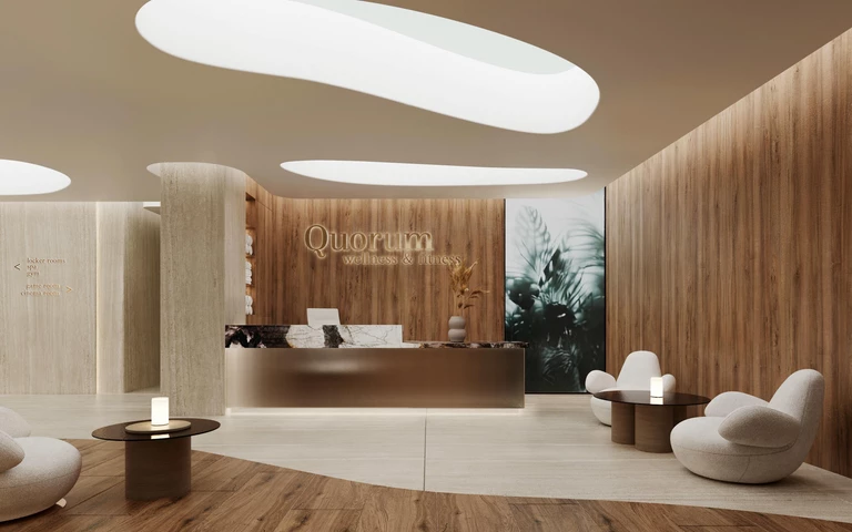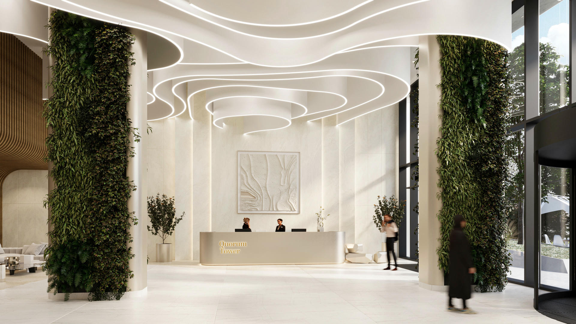 To właśnie wysokie na 7-metrów lobby z całodobową recepcją będzie wizytówką Quorum. To przestrzeń, która od progu ma komunikować jakość i dbałość o detale, tak charakterystyczne dla segmentu premium.