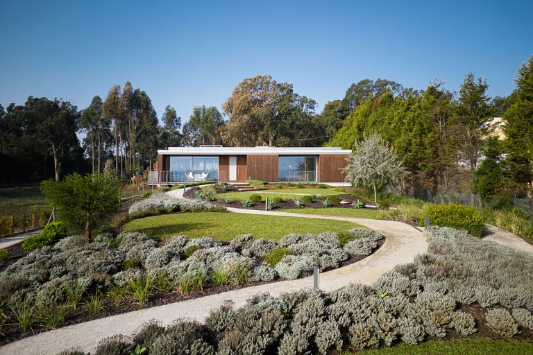 Biorąc pod uwagę potrzeby inwestora, architekci podjęli decyzję o zaprojektowaniu dwukondygnacyjnego, przestronnego budynku. Surowość jego prostej bryły została przełamana elewacją z drewna o ciepłej barwie. Co więcej, autorzy projektu dostosowali dom do znaczących nierówności terenu, wpisując go w zbocze. Wskutek tego zabiegu z perspektywy ogrodu i ulicy budynek zdaje się posiadać jedynie jedną kondygnację.